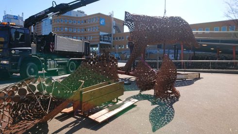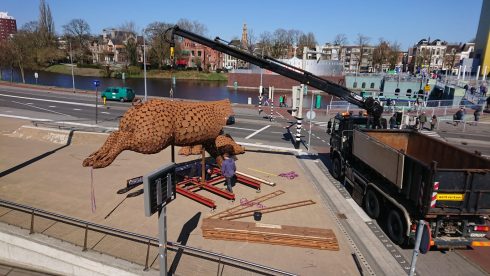 Het kunstwerk ‘Ode aan het Varken’ van kunstenares Jantien Mook moet de inwoners van Groningen stil laten staan staan bij het welzijn van dieren. Het varken wordt momenteel van een vrachtwagen geladen en opgebouwd.