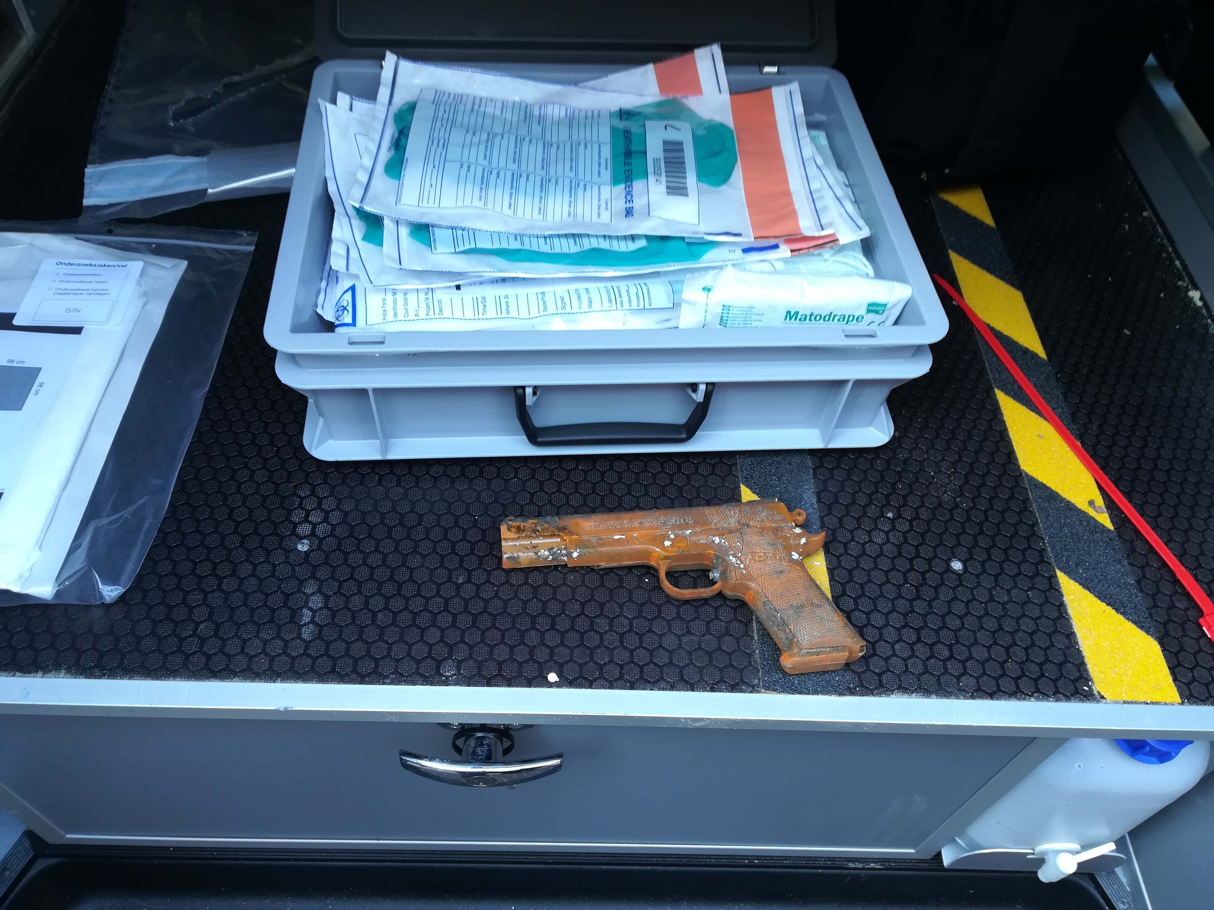 Het voorwerp bevond zich in de dakgoot van het voormalig koetshuis van de familie Scholtens aan de Sint Jansstraat. Bouwvakkers zagen het liggen en sloegen alarm. Na onderzoek bleek het om een pistool van plastic te gaan.