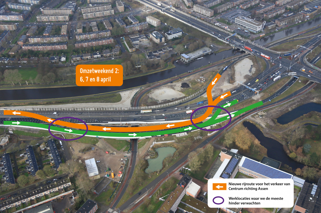 Omwonenden kunnen hinder ondervinden van de werkzaamheden. Vanaf zaterdag om 7.00 uur tot maandag 6.00 uur wordt daar zowel overdag als ’s nachts op twee plekken gewerkt. Dan wordt de tijdelijke weg gereedgemaakt voor het verkeer richting Assen. Er wordt onder meer asfalt verwijderd en geleiderails verplaatst.