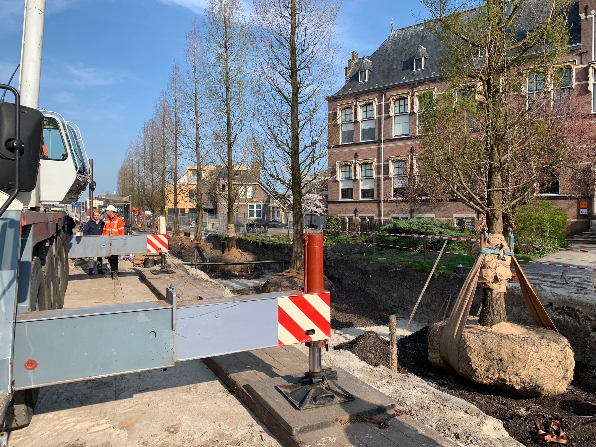 De bomen zijn geplant aan de Bloemsingel op de plek waar de komende maanden een nieuw busknooppunt gebouwd gaat worden. Die werkzaamheden moeten aan het einde van het jaar afgerond zijn.