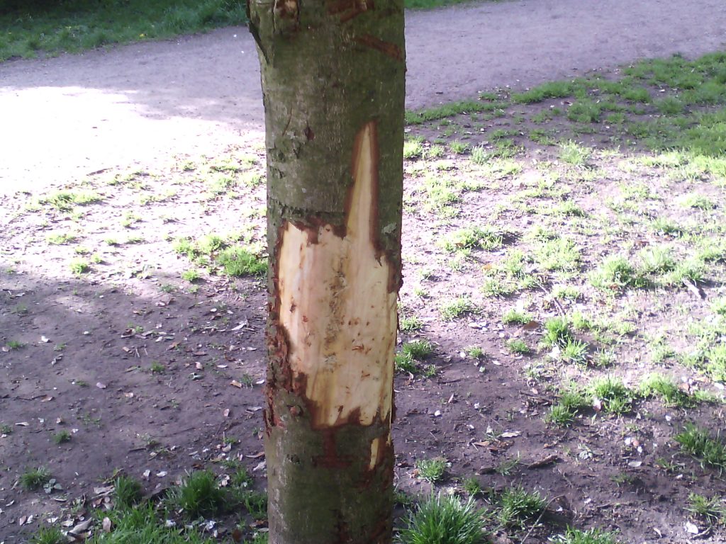 Een recentelijk geplaatste kastanje op het speelveld bij Zondag is op meerdere plekken beschadigd. Een oude wilg even verderop raakte een groot stuk bast kwijt.