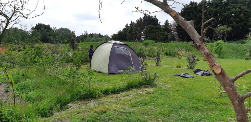 ‘Op Hemelvaartsdag openen wij onze camping. Wij hebben de pingpongtafel en de badmintonrackets, een kast vol spelletjes, boeken en een abo op de Donald Duck voor als het regent. Wij hebben een prachtig gemaaid ietwat bobbelig grasveld, waar plek is voor alleen tenten, geen caravans, geen campers. En een campinggebouw met douches, toiletten, wasbakken en een overdekte ruimte met zitplekken. Neem je gitaar of blokfluit mee, voor bij het kampvuur. Verder regelen we niks, jullie zijn je eigen animatieteam. Niks hoeft, (bijna) alles mag’, meldt Tuin in de Stad.