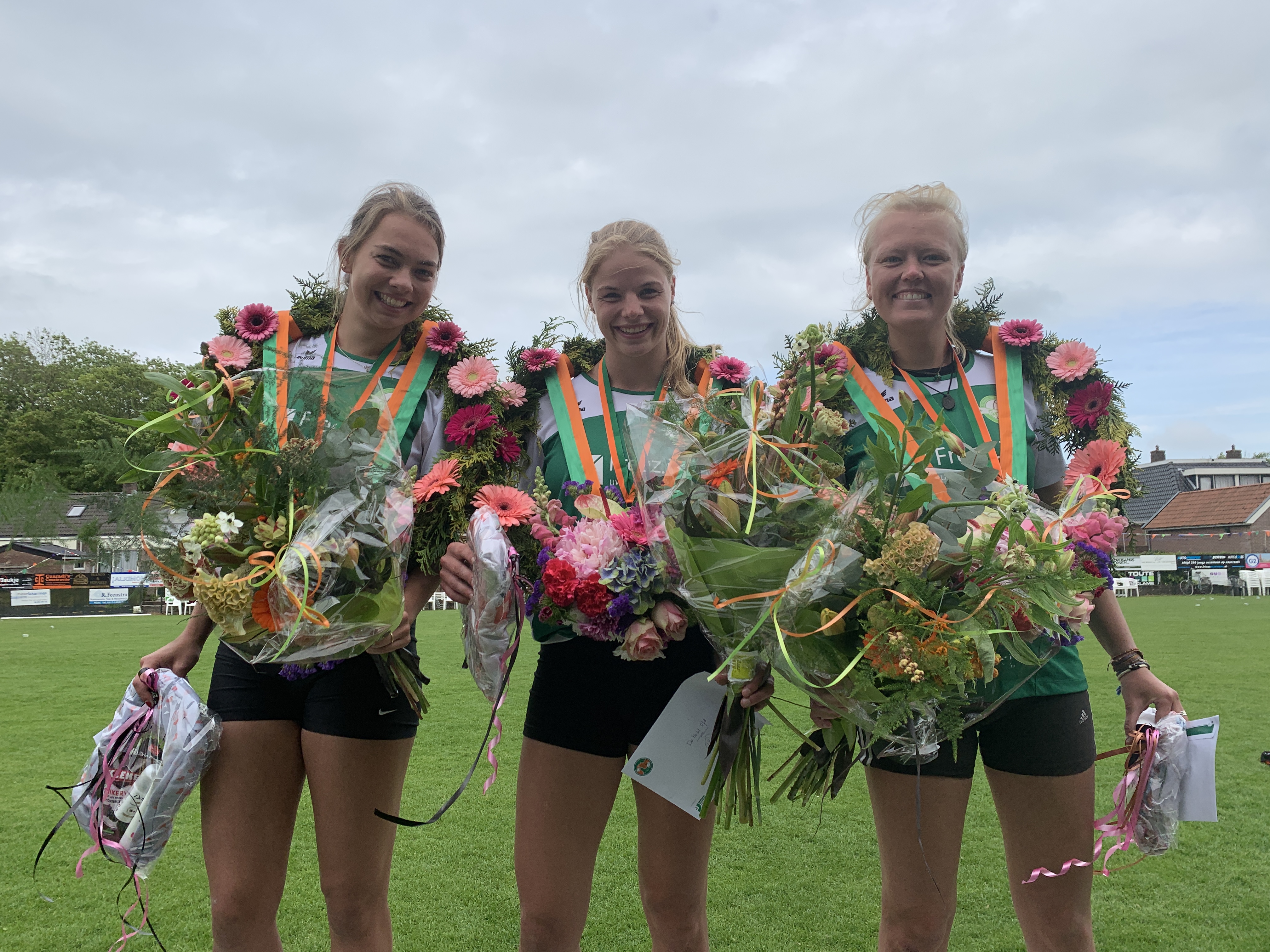 Anne Monfils, Jeska de Boer en Marrit Zeinstra winnen de afdelingswedstrijd voor de dames hoofdklasse in Dronryp. Foto: Aise van Beets
