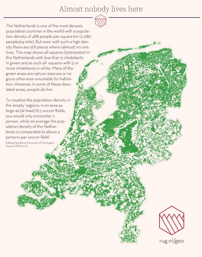 Gemiddeld wonen in Nederland 488 mensen per vierkante kilometer en stond ons land in 2017 op plek 29 bij de dichtstbevolkte landen. Maar er zijn veel plekken in Nederland waar bijna niemand woont. ‘In een gebied zo groot als achtenhalve voetbalvelden kom je in de groene gebieden hooguit één persoon tegen’, schrijft de Geodienst in de toelichting.