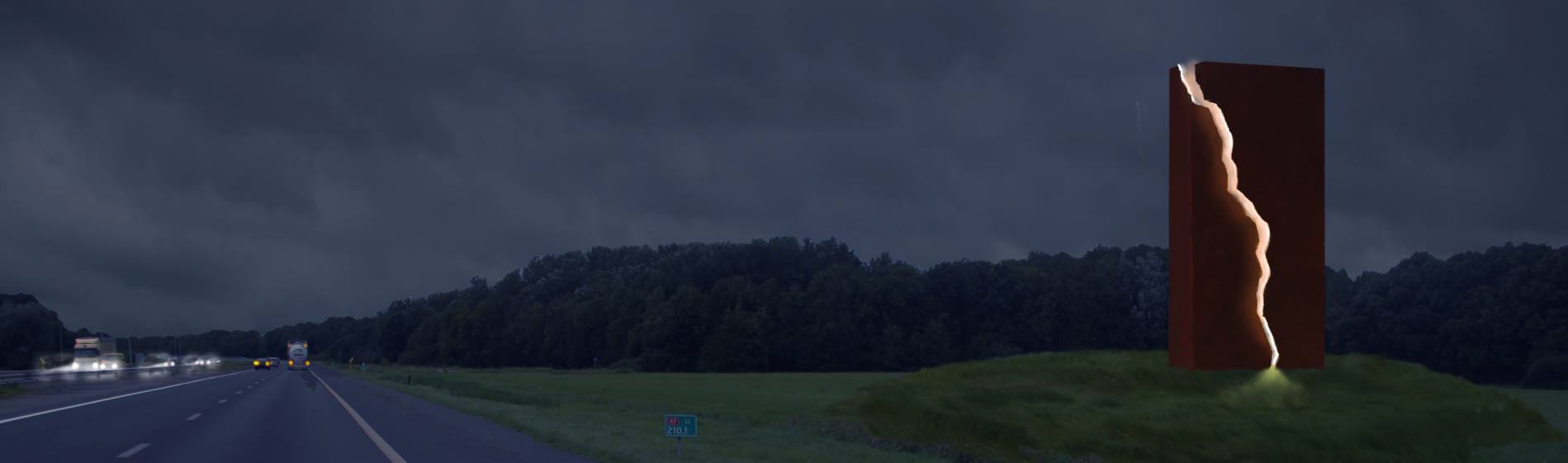 Het Andere Monument van Karel Buskes uit Groningen wordt 28 mei langs de A7 ter hoogte van Harkstede onthuld als tegenhanger van het reusachtige Gasmolecuul, dat verderop in de middenberm van de A7 staat.