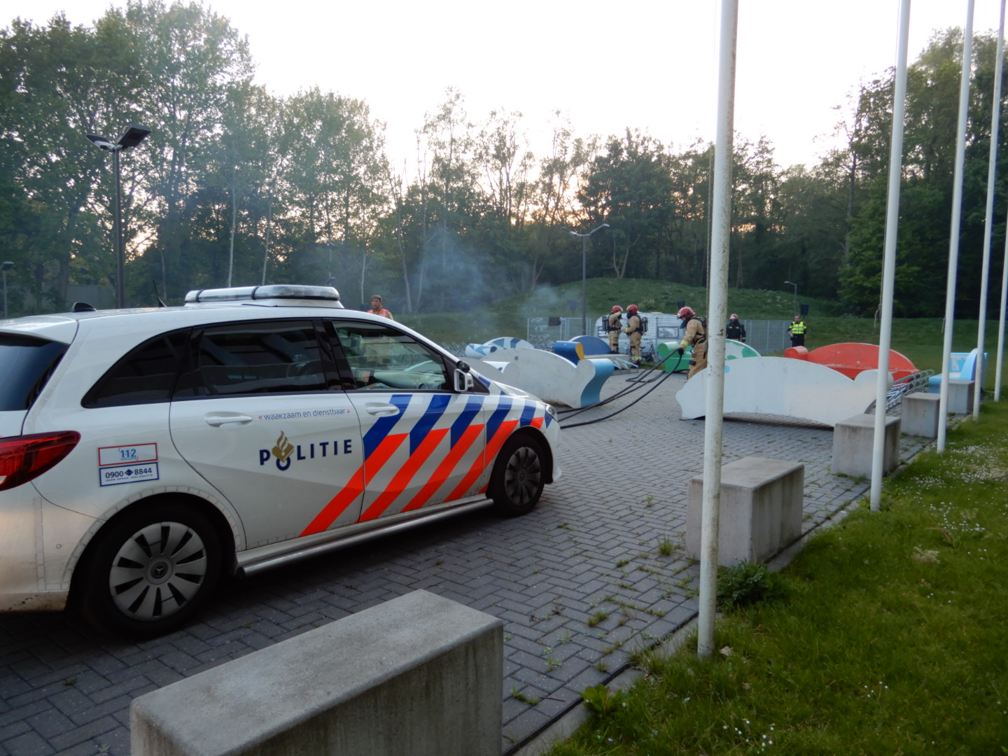 De melding van de brand kwam rond 20.45 uur bij de hulpdiensten binnen. De Harense brandweer rukte daarop uit met een bluswagen. Bij aankomst bleek er brand te woeden in een partytent die op het schoolterrein was opgebouwd. De tent zou de afgelopen week gebruikt zijn voor een projectweek. Brandweerlieden hebben het vuur bestreden maar konden niet voorkomen dat de tent verloren ging. Een caravan kon wel behouden worden.