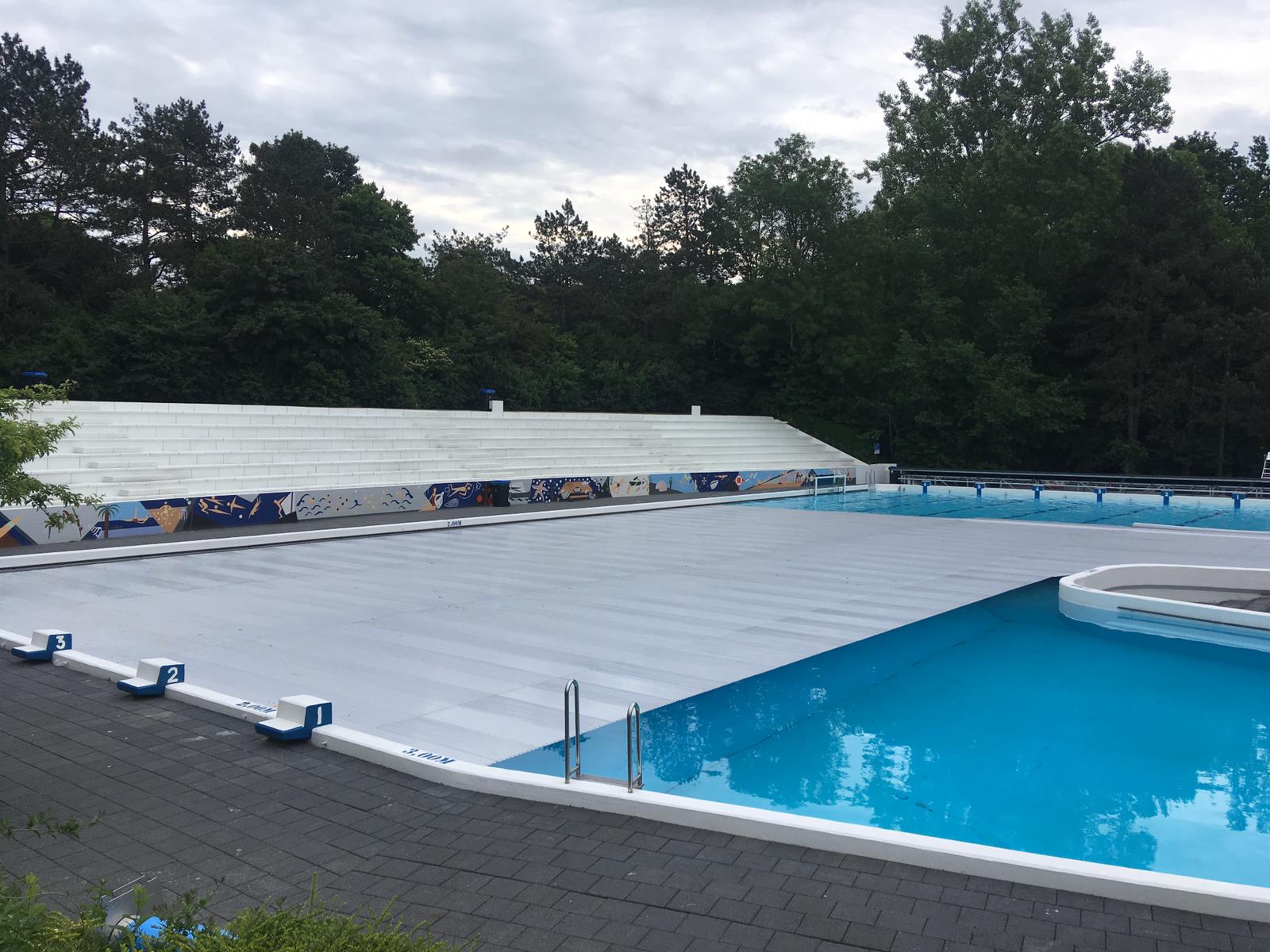 Het afdekzeil bleef over het bad hangen. Het is nog niet duidelijk wanneer het probleem verholpen is.