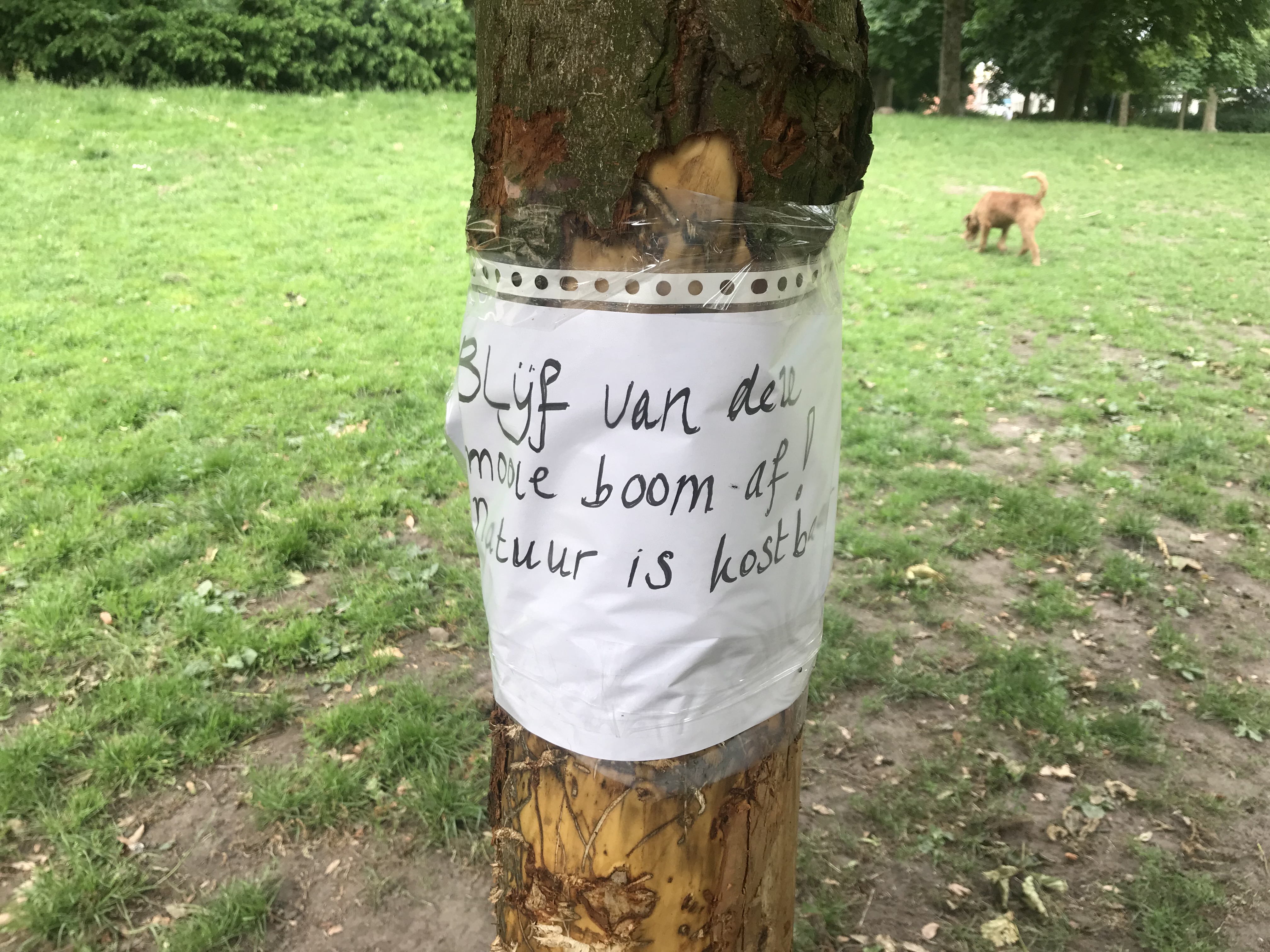 ‘Blijf van deze mooie boom af. Natuur is kostbaar’, luidt de tekst op een plakkaat dat dit weekend aan de beschadigde boom is bevestigd.