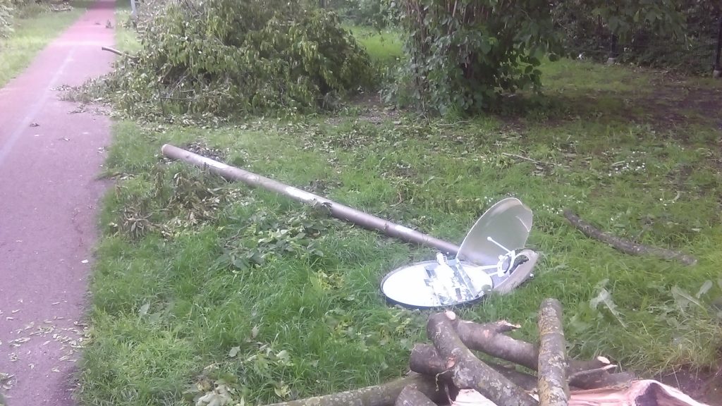 De lantaarnpaal ging om op het fietspad tussen De Hoogte, langs het spoor, en het fietspad langs de noordelijke ringweg. Mogelijk is de lantaarnpaal “meegenomen” door een boom of een grote tak tijdens het noodweer, want er was veel schade aan het groen op het pad.