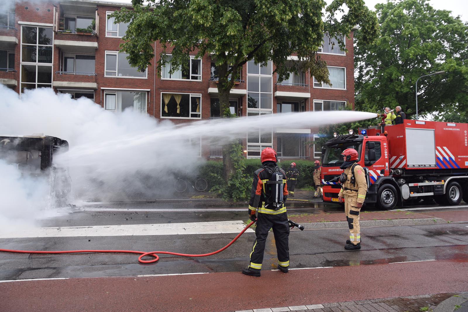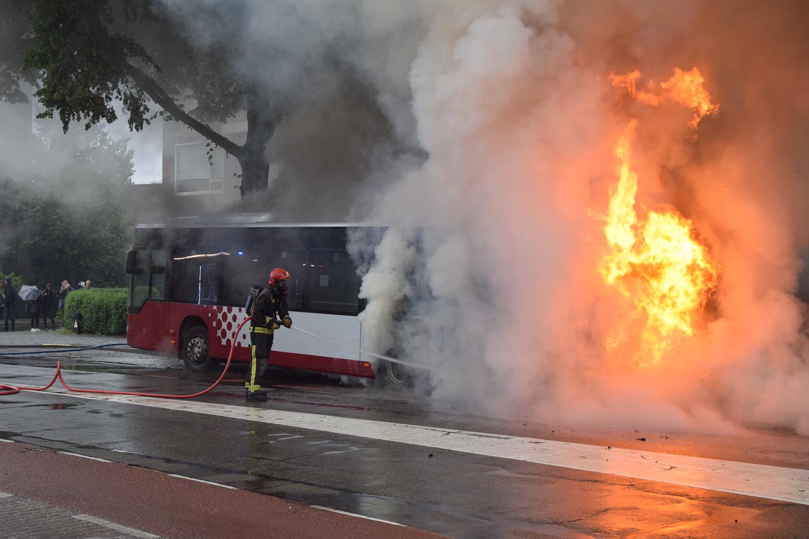 “De brand is inmiddels grotendeels onder controle”, vertelt Rick ten Cate van tencatefotografie.nl. “Brandweerlieden hebben het vuur geblust met schuim. De bus is aan de achterkant volledig uitgebrand. Vanwege de brand is de weg vanaf het Overwinningsplein tot aan de rotonde Vondellaan afgesloten. Hier ligt ook een vrij lang oliespoor.”