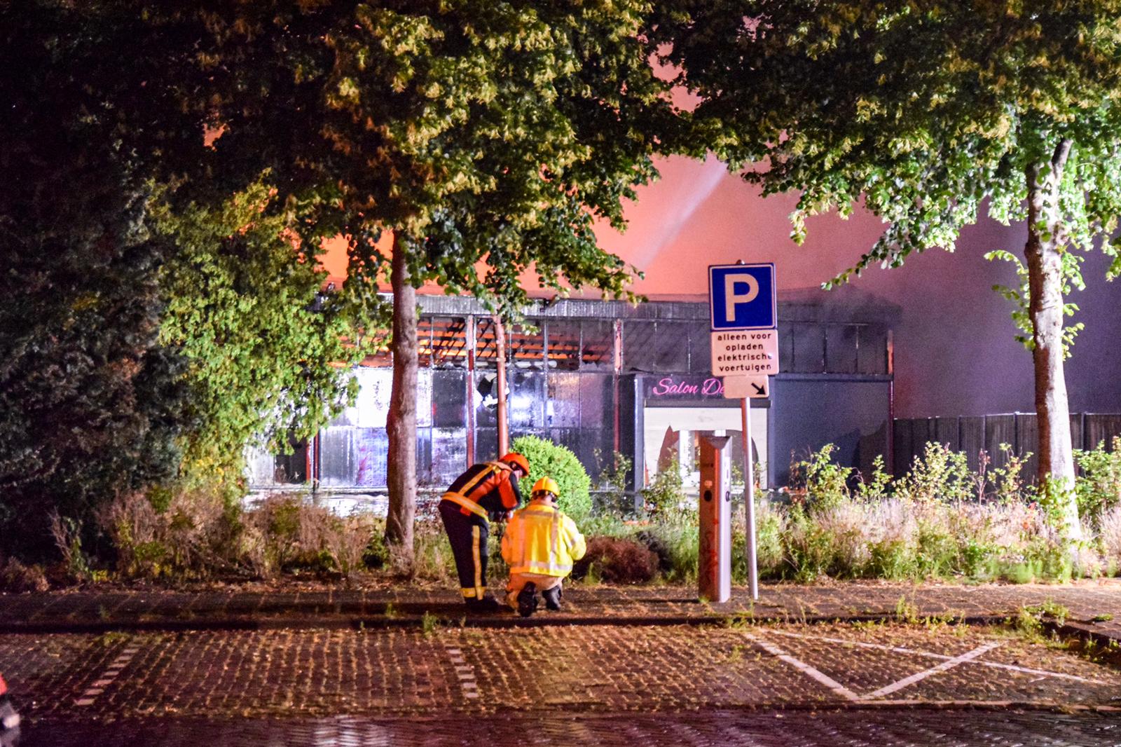 Eerste foto’s van de massagesalon laten zien dat het gebouw zwaar beschadigd is geraakt. Brandweerlieden zijn op dit moment nog volop bezig om het vuur te bestrijden.