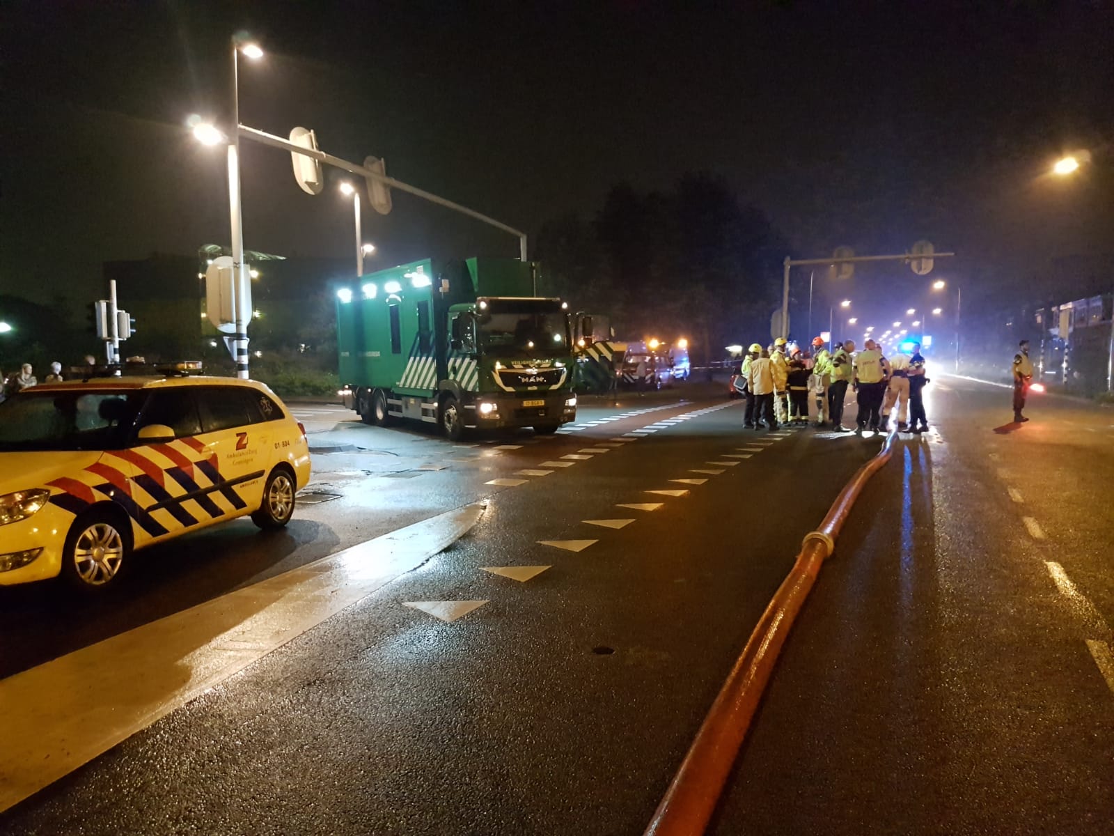 Het bluswater voor de brandbestrijding wordt uit het Eemskanaal gehaald. “Momenteel is de brandweer bezig om een tweede groot water transport op te bouwen”, vertelt incidentfotograaf De Jager. “Dit betekent dat er nu twee pompen staan die water uit het Eemskanaal via dikke slangen naar de Oliemuldersweg transporteren.”