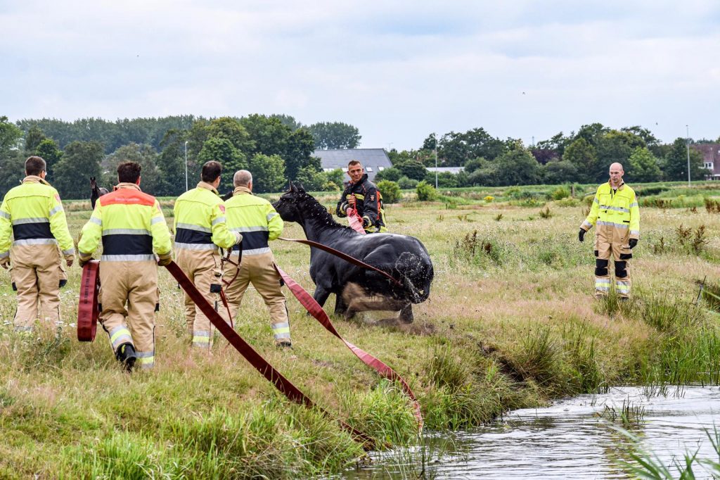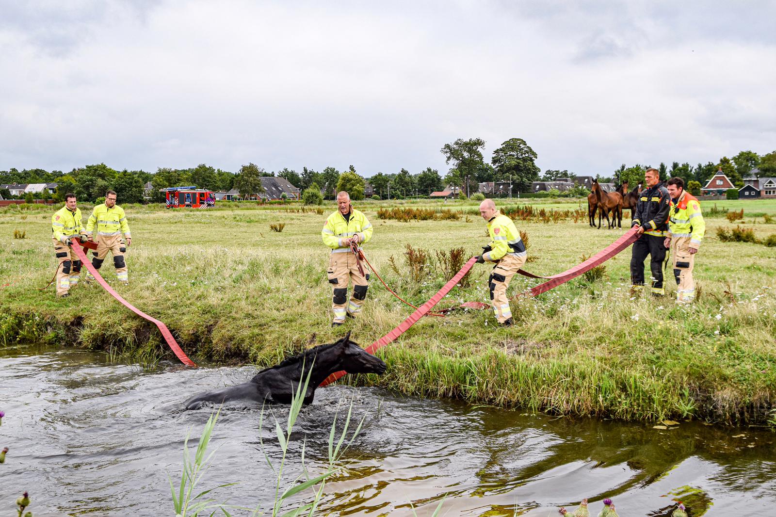 Terwijl de duikers onderweg waren besloot de bemanning van de bluswagen nog een tweede poging te wagen. “Met behulp van brandslangen die onder het dier waren doorgehaald, en met vereende krachten van brandweerlieden en omstanders die kwamen helpen, lukte het om het paard veilig op de wal te helpen.” Volgens Ten Cate voegde het dier zich daarbij snel bij de andere paarden in het weiland, die de hele reddingsactie nauwlettend hadden gevolgd.