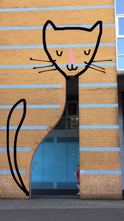 ‘Ik heb er verder niet echt een verhaal bij. Ik zag plotseling een kat in het gat van het gebouw toen ik op de bus stond te wachten. En heb toen een foto gemaakt en het in instagram bewerkt. Daarna gedeeld op twitter. Daar kreeg ik veel reactie op. Dus heb ik deze versie in photoshop gemaakt’.
