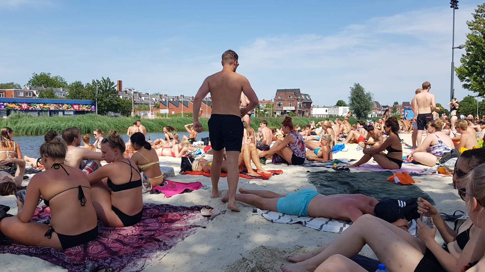 Zonnen en afkoelen. Deze Groningers trotseren de hitte en genieten op een vol stadsstrand bij het Infoversum aan de Bloemsingel.