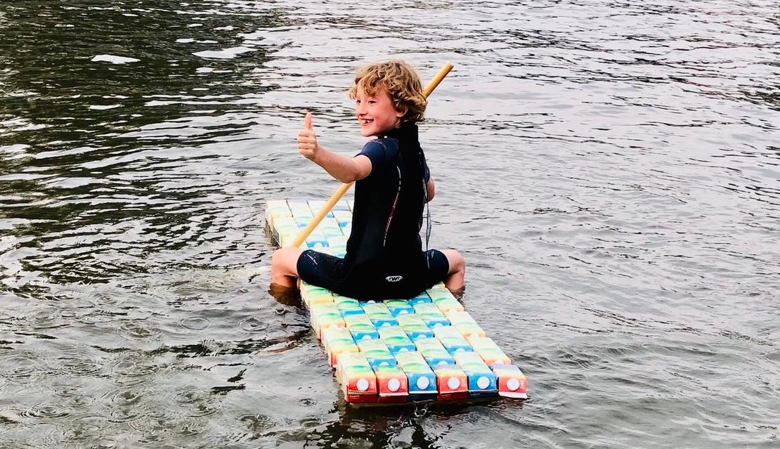 “Ik wilde graag een boot en het zelf bouwen leek me wel cool. Toen ging ik nadenken waarmee ik het goed en goedkoop zou kunnen maken en kwam op lege melkpakken uit. Die kosten namelijk niets en blijven prima drijven”, zo vertelt Taegan.