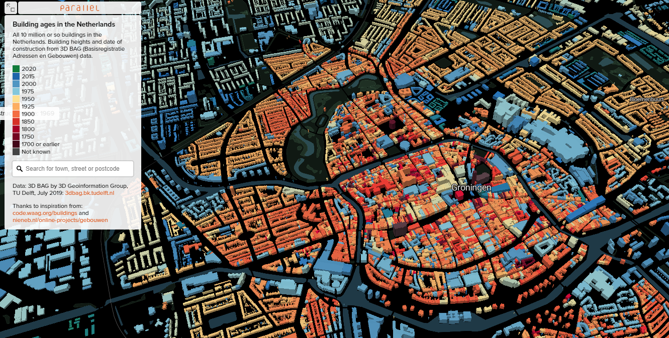 Er is zojuist een interactieve driedimensionale kaart op internet verschenen, die het bouwjaar van alle 10 miljoen Nederlandse huizen laat zien. Tot en met de elektriciteitshuisjes bij het Noorderplantsoen.