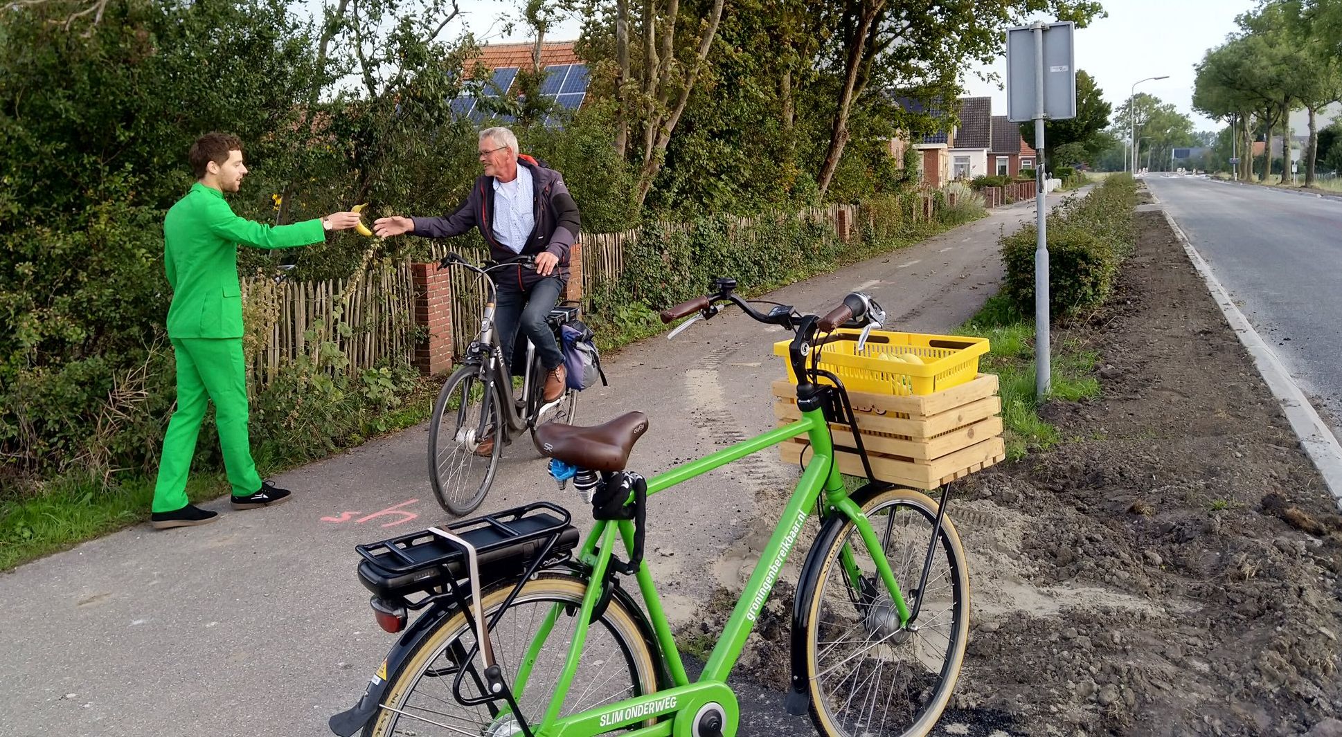 Fietsers tussen Groningen en Adorp werden dinsdagochtend in het zonnetje gezet door een man in een groen pak van ‘Groningen Bereikbaar’.