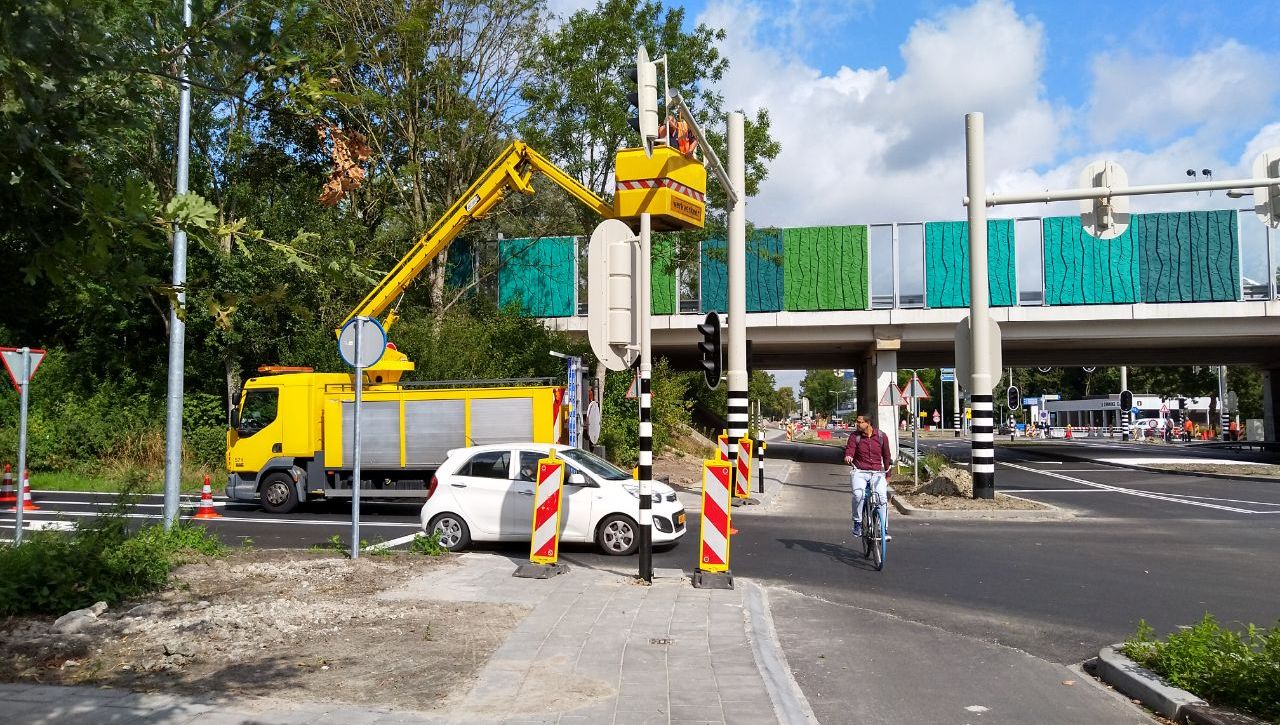 De afrit van de ringweg is verbreed voor een betere doorstroming van het verkeer. Het gebied onder de ringweg is vernieuwd en overzichtelijker ingericht voor fiets- en autoverkeer. Volgende week maandag moet de afrit weer open zijn voor het verkeer.