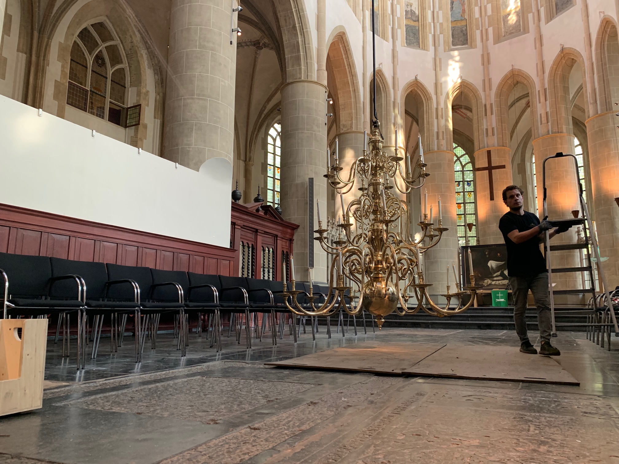 Donderdagochtend even voor 09.00 uur arriveerde een vrachtwagen bij de kerk met aan boord de vier kroonluchters. “Ik ben best wel zenuwachtig”, laat koster Jan Haak van de Martinikerk weten. Van een afstandje volgt hij de verrichtingen. Met een vorkheftruck worden één voor één hele grote houten boxen uit de vrachtwagen gehaald en daarna met vereende krachten en uiterste precisie de kerk binnengebracht. “Het is net pakjesavond. Ik zal je ook eerlijk zeggen dat ik mijn hoofd niet bij mijn andere werkzaamheden kan houden. Ik ben veel te nieuwsgierig.”