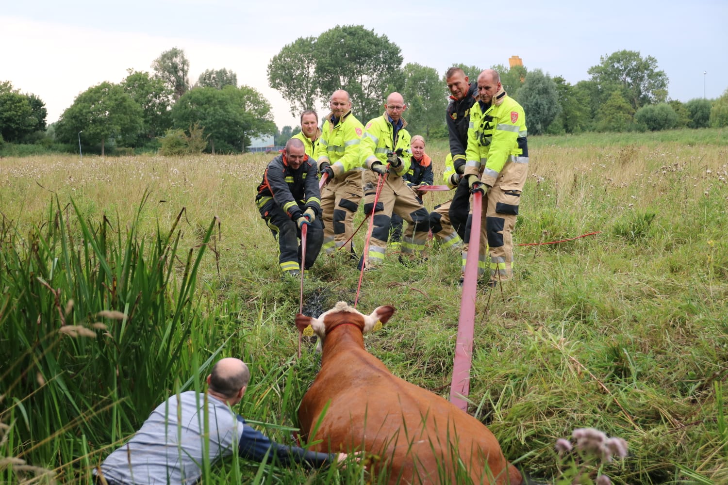 Na anderhalf uur lukte het om de koe te bevrijden. “Ook de boer hielp mee, en ook de kraan van de hulpverleningswagen werd ingezet.” Hoe het dier te water kon raken is onbekend.