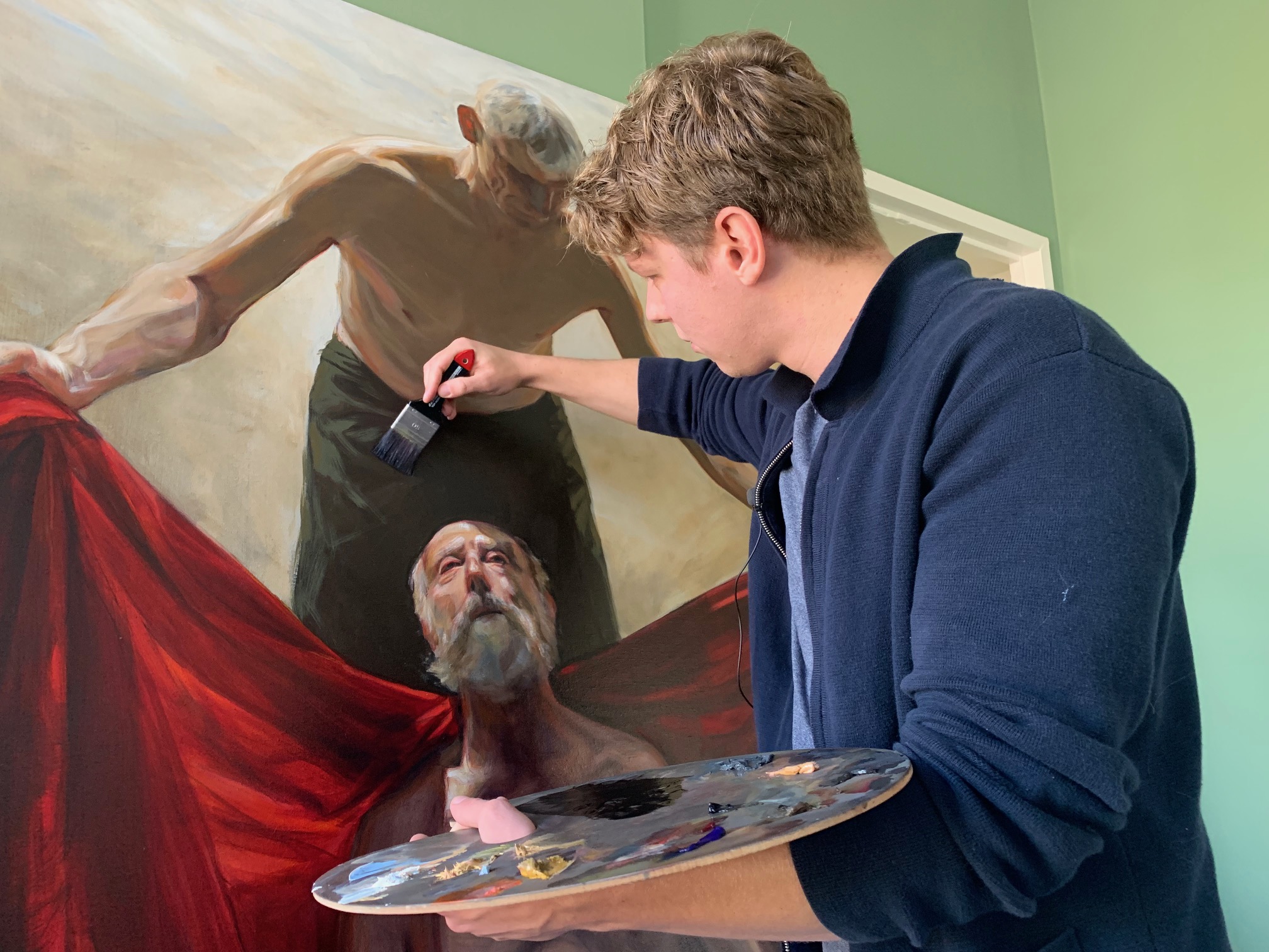 Hij is er jaren zoet mee: de Groningse schilder Egbert Modderman (29). De zeven schilderijen die hij voor de Martinikerk maakt moeten uiteindelijk komen te hangen in de kooromgang.