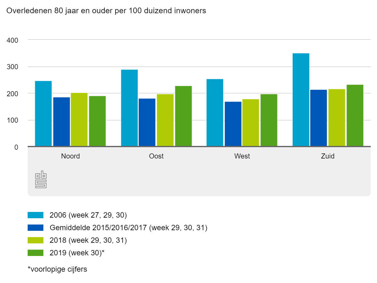 Gemiddeld sterven er tijdens de warmste zomermaanden 185 tachtig-plussers in Noord-Nederland. In 2018 steeg dit aantal tot 203 sterfgevallen. Tijdens dezelfde periode in dit jaar daalde dit naar 191 overledenen, terwijl de temperaturen juist hoger waren dan voorgaande jaren.