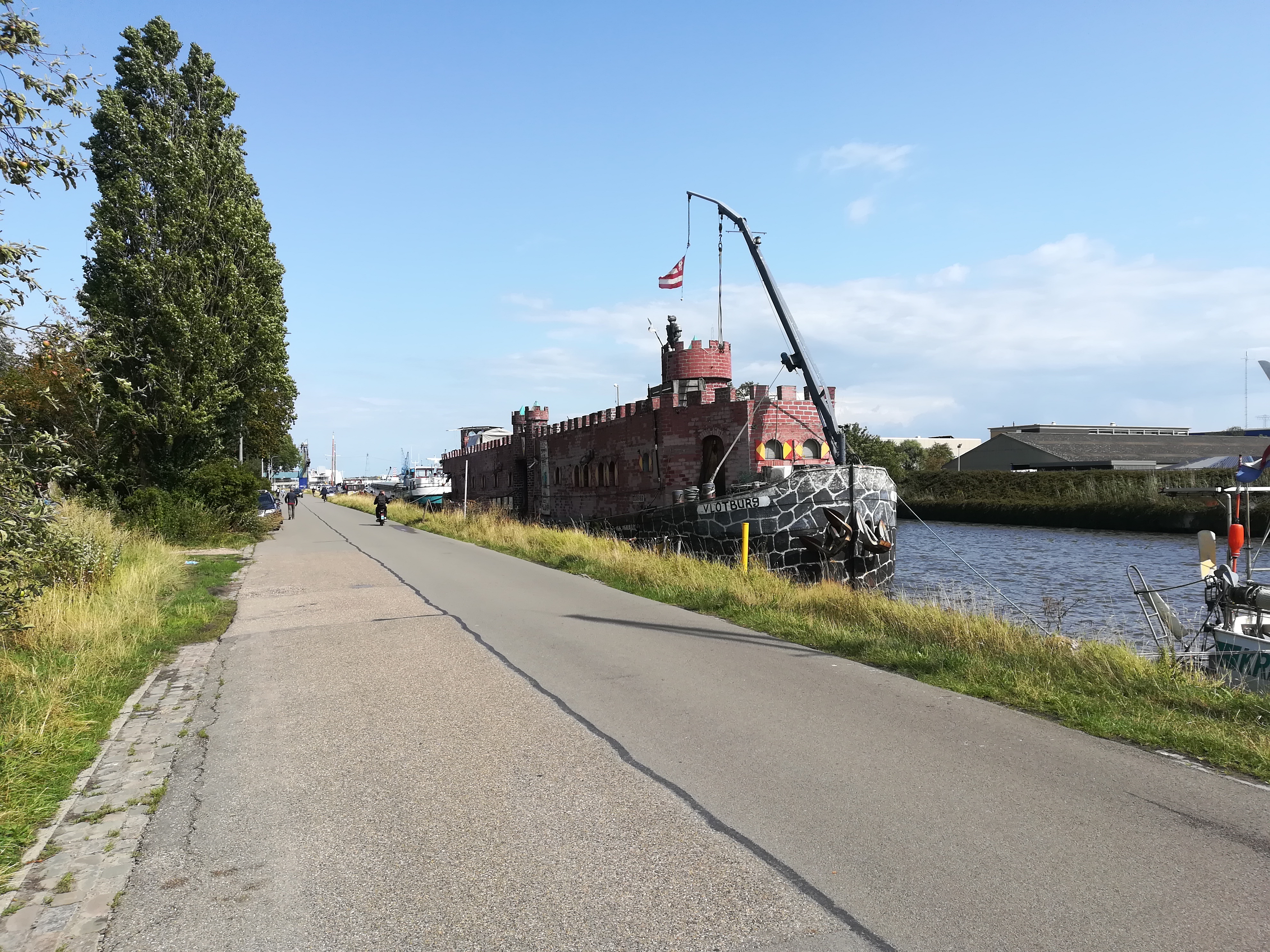 Je zou zeggen dat bestaat niet, een ridder op een drijvend kasteel. Maar toch is het waar in het Eemskanaal ligt het afgemeerd: Museumschip Vlotburg.