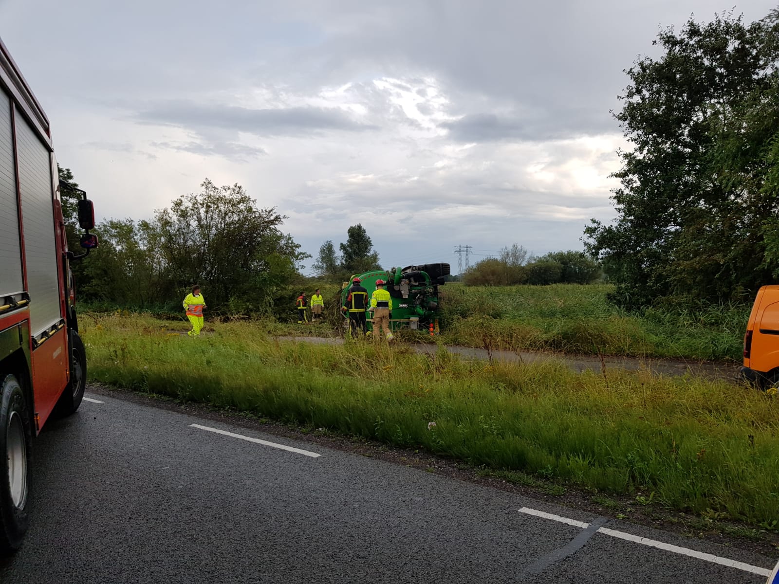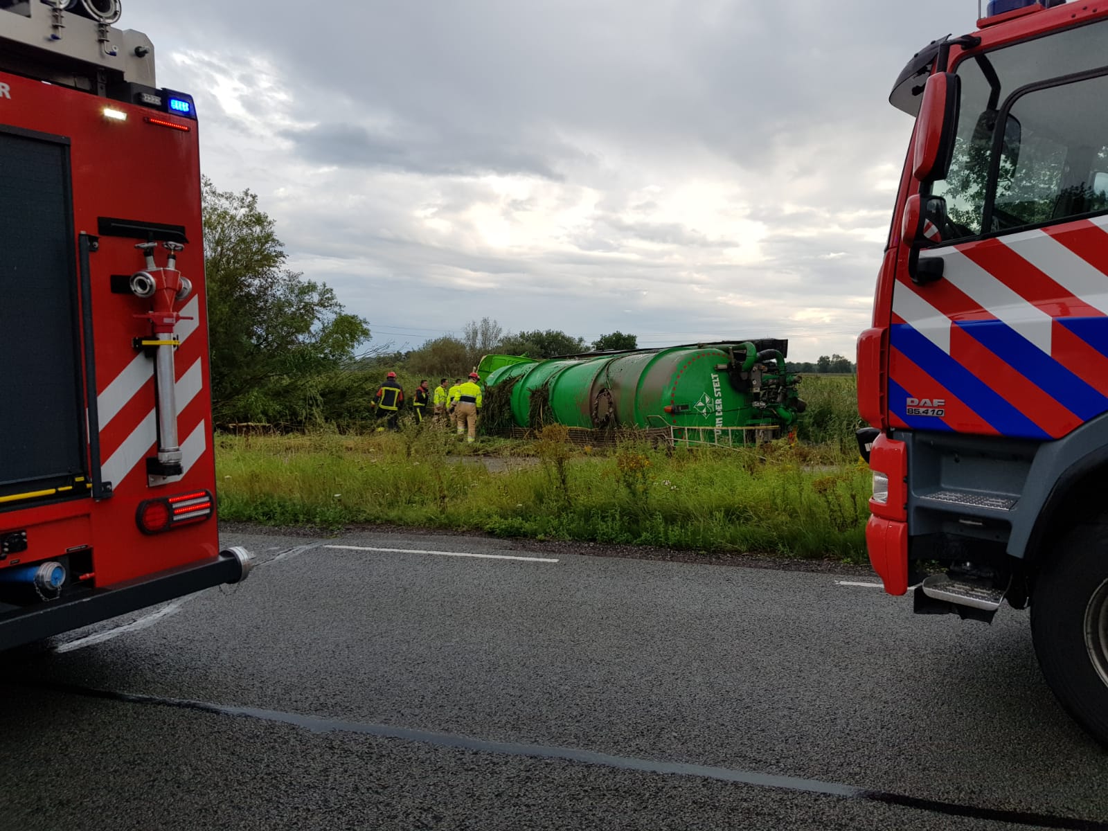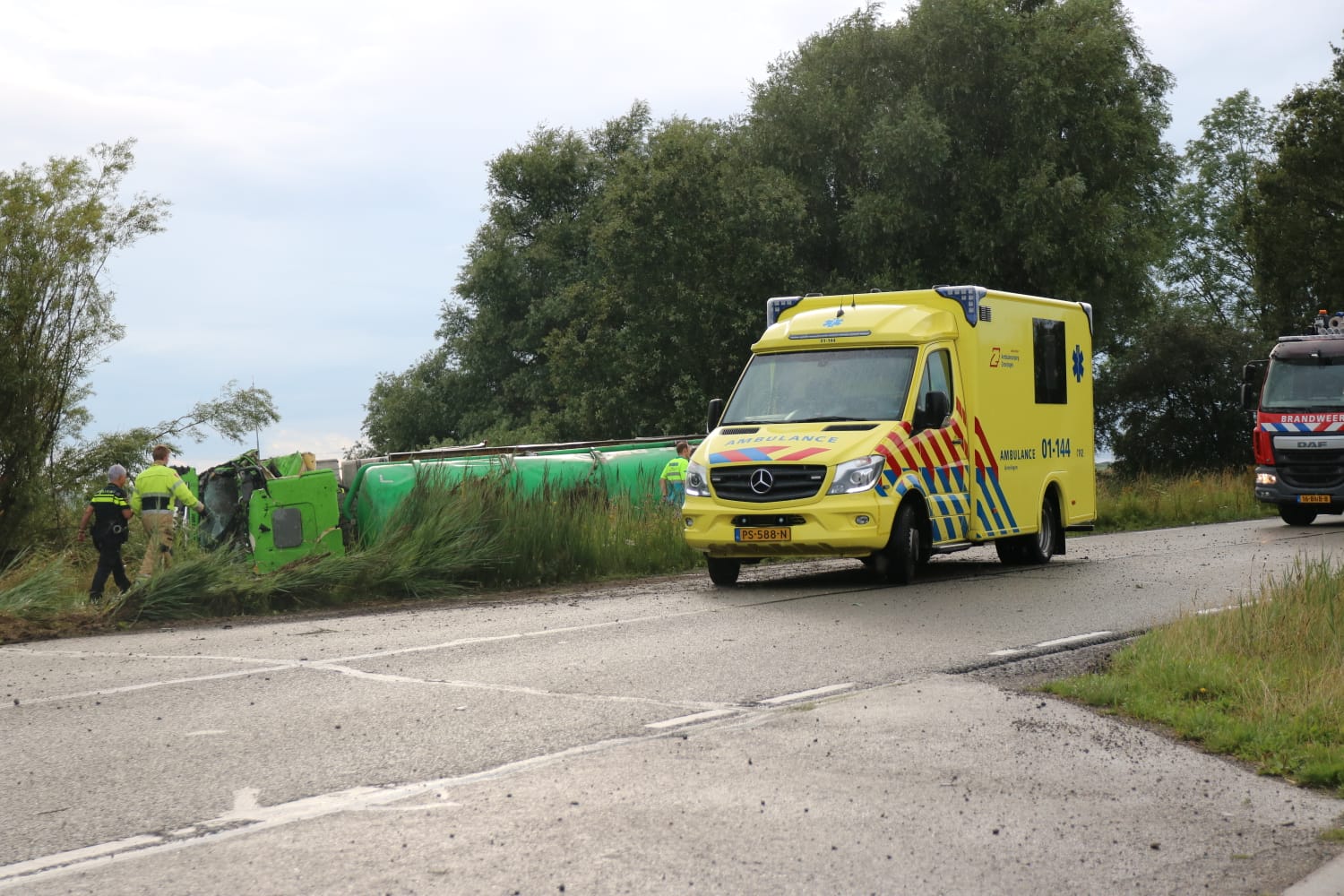 Het ongeluk gebeurde even voor 18.30 uur. De vrachtwagen werd vermoedelijk geraakt door een tegemoetkomende auto. Door de botsing belandde de truck op zijn kant en schoof een aantal meters door de berm in. Twee personen raakten gewond. Ze zijn met onbekende verwondingen overgebracht naar het ziekenhuis.