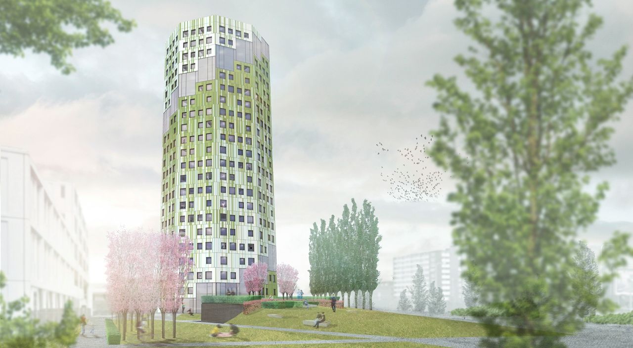 De Helix, de woontoren die in de Hoogte gebouwd wordt, heeft dinsdagmiddag haar hoogste punt bereikt. In de 68 meter hoge flat komen 222 sociale huurwoningen.