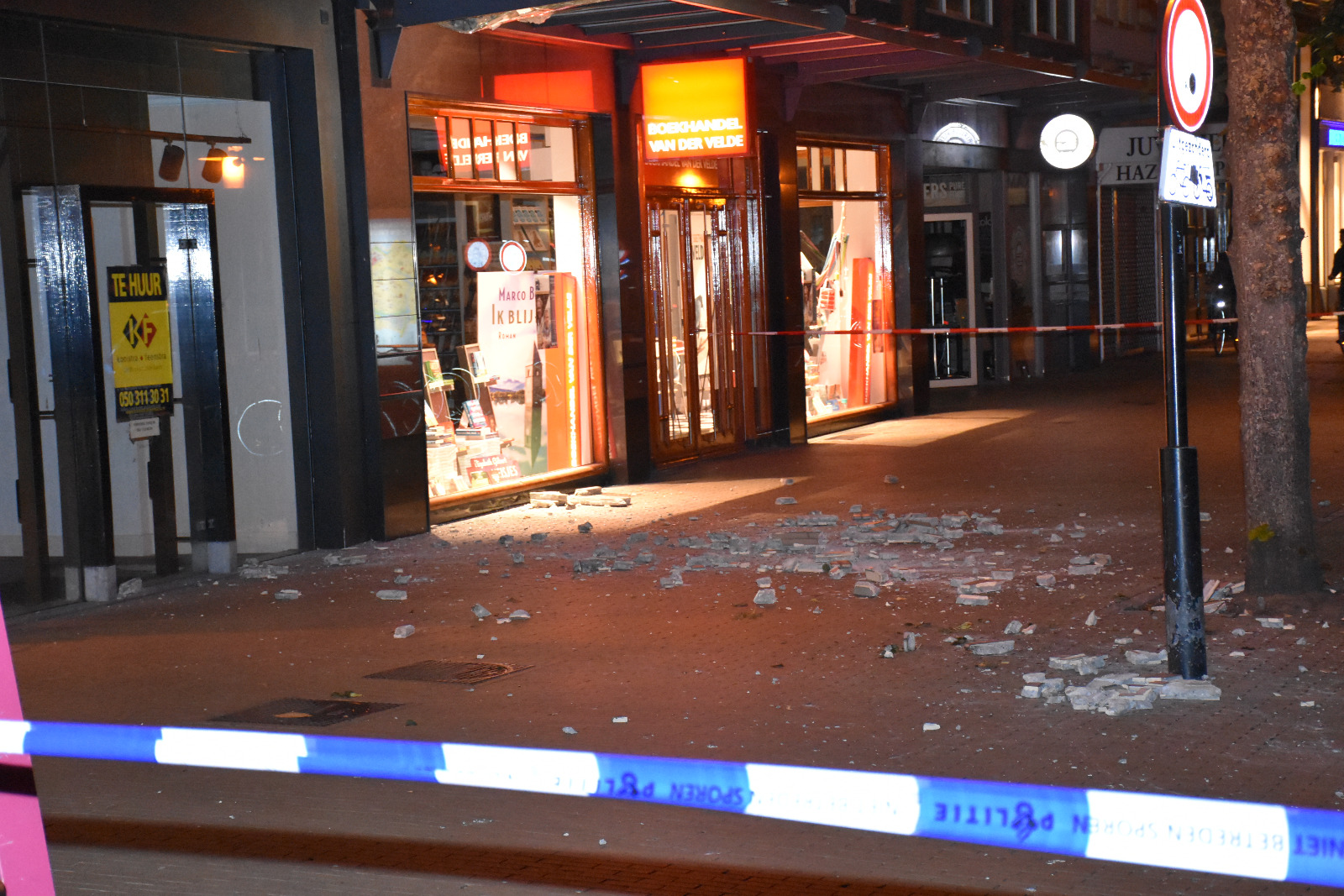 De stenen vielen dwars door een afdak heen en ook een deel van de verlichting kwam naar beneden. Het trottoir is afgezet. Restaurant Wereldburgers en juwelier Hazekamp, de buren van Van der Velde, zijn inmiddels weer open. Van der Velde hoopt vrijdag weer open te gaan.