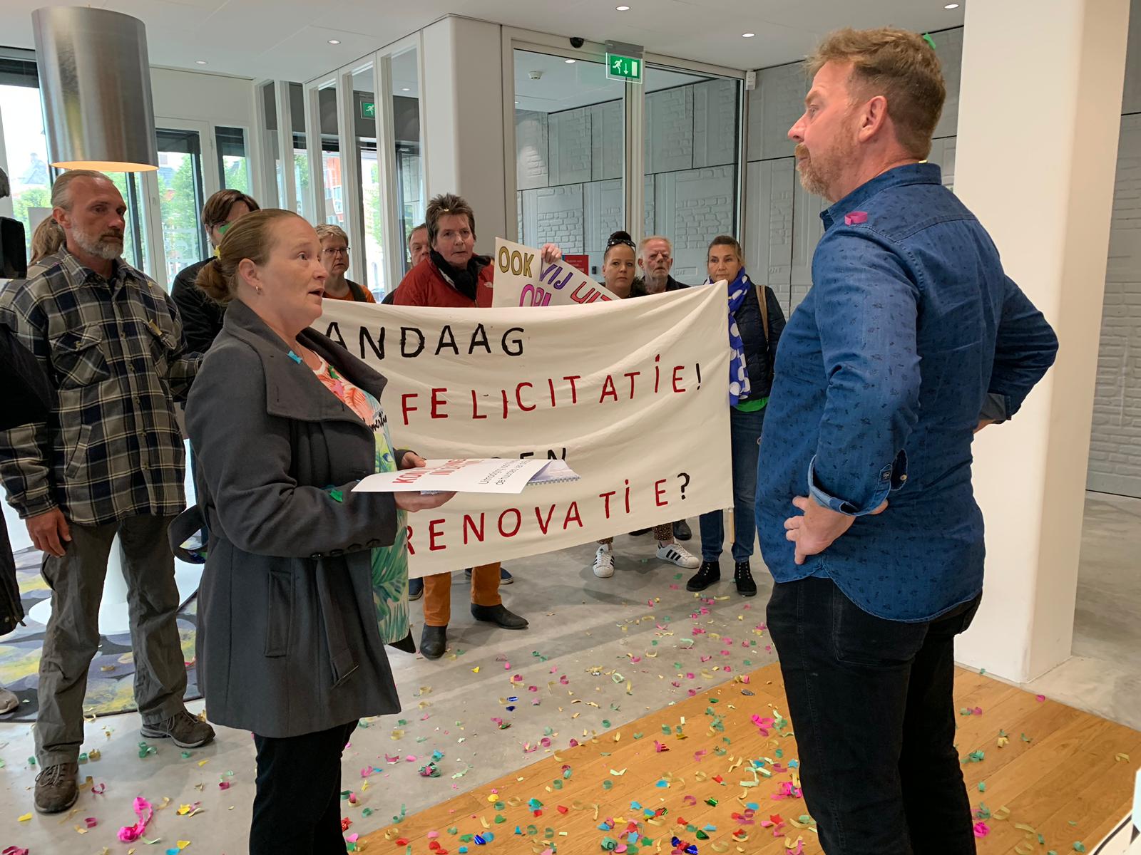 Nijestee bestaat 100 jaar. Een door Nijestee georganiseerde fietsexcursie met lokale politici begon deze woensdagmorgen met een protestactie van huurders en SP.