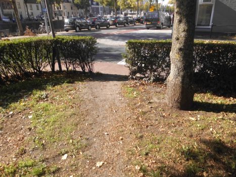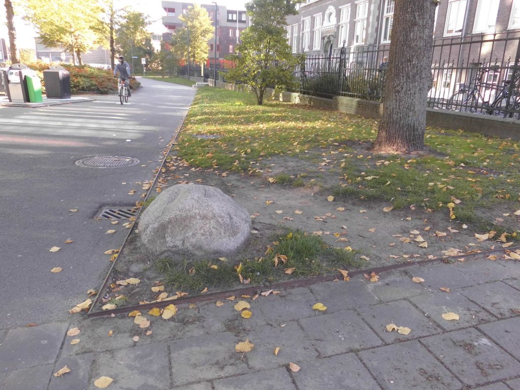 Hierboven op de foto een situatie nabij De Beren. Er is een dikke kei geplaatst om het stedelijk ontwerp te accentueren. Het publiek kiest de kortste weg.
