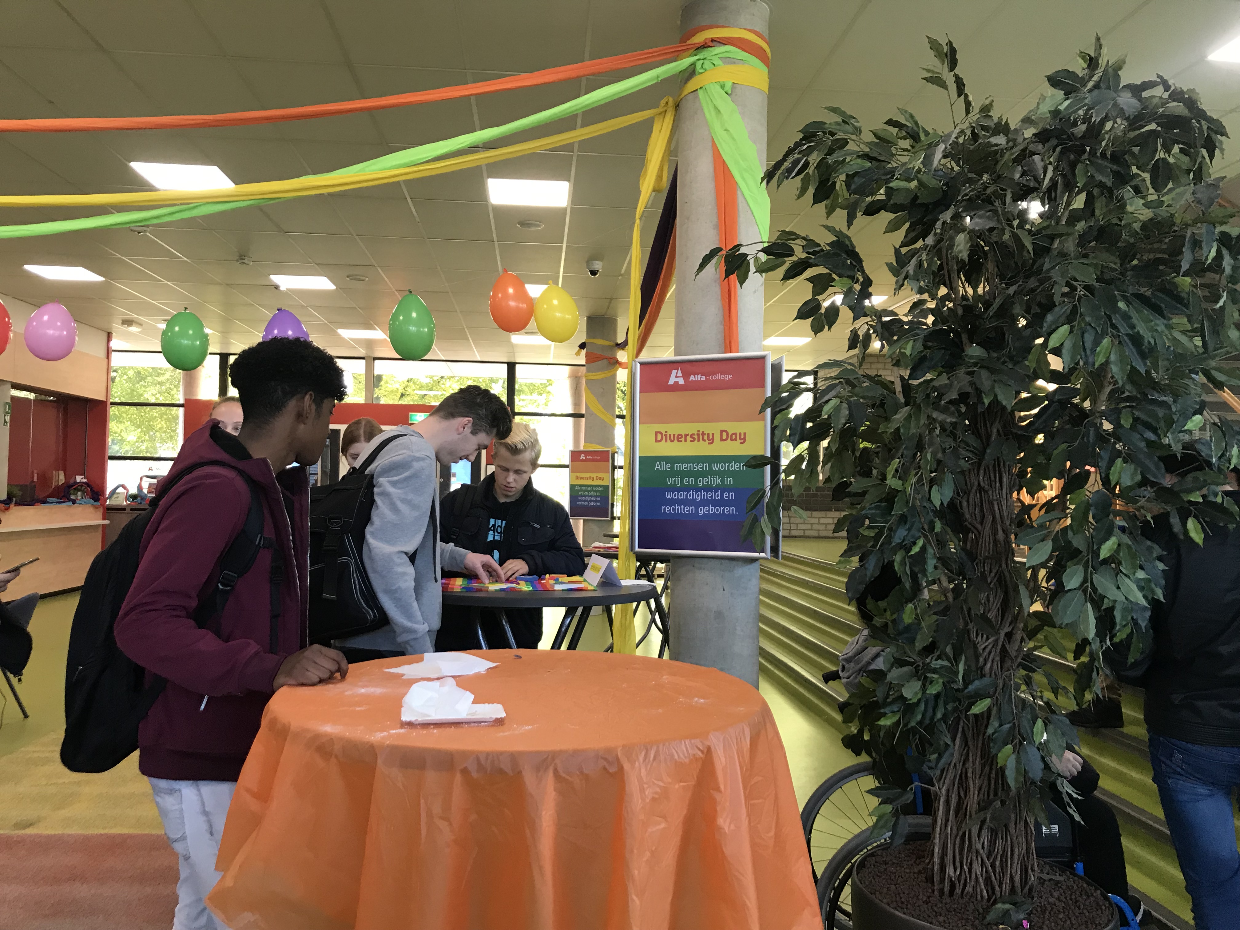 Op deze dag viert het Alfa College de diversiteit op het gebied van, afkomst, genderidentiteit en seksualtiteit van hun studenten. De school heeft verschillende dingen georganiseerd zoals een workshop Salsa dansen, een photo booth en een diversiteitsmarkt. Initiatiefneemster Jeltje Kok, heeft de diversiteitsdag georganiseerd omdat, ze het belangrijk vindt dat iedereen zichzelf kan zijn op school. ‘Het is vooral een feest. We zijn heel blij dat we een zo’n verschillend en divers gezelschap hebben,’ zegt Kok. Het is al de vijfde keer dat de school de diversiteitsdag viert. ‘Wij hebben een stropdas waarmee we ook de diversiteits aangeven. Heel veel techniekdocenten dragen die en dan hopen we dat de leerlingen in de klas vragen stellen over de stropdas, zodat er een gesprek op gang komt,’ zegt Kok.