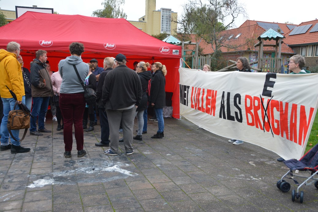 Directeur Bregman van Nijestee bezocht dinsdag twee huurders in de Bloemenbuurt. Tijdens zijn bezoek werd hij verwelkomd door tientallen huurders met een spandoek met de tekst “Niet lullen als Bregman”.