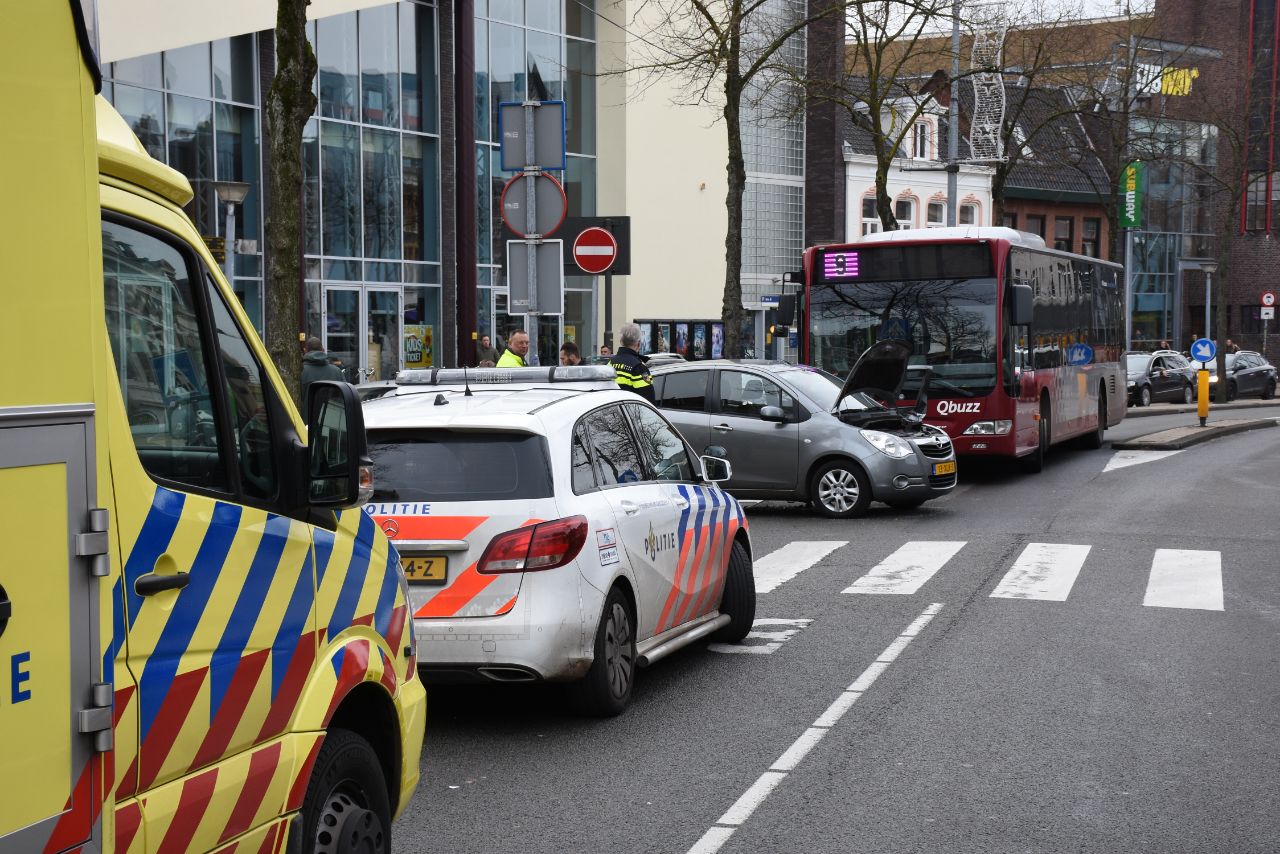 Een bus en een auto zijn donderdagmorgen op het Zuiderdiep met elkaar in botsing gekomen.