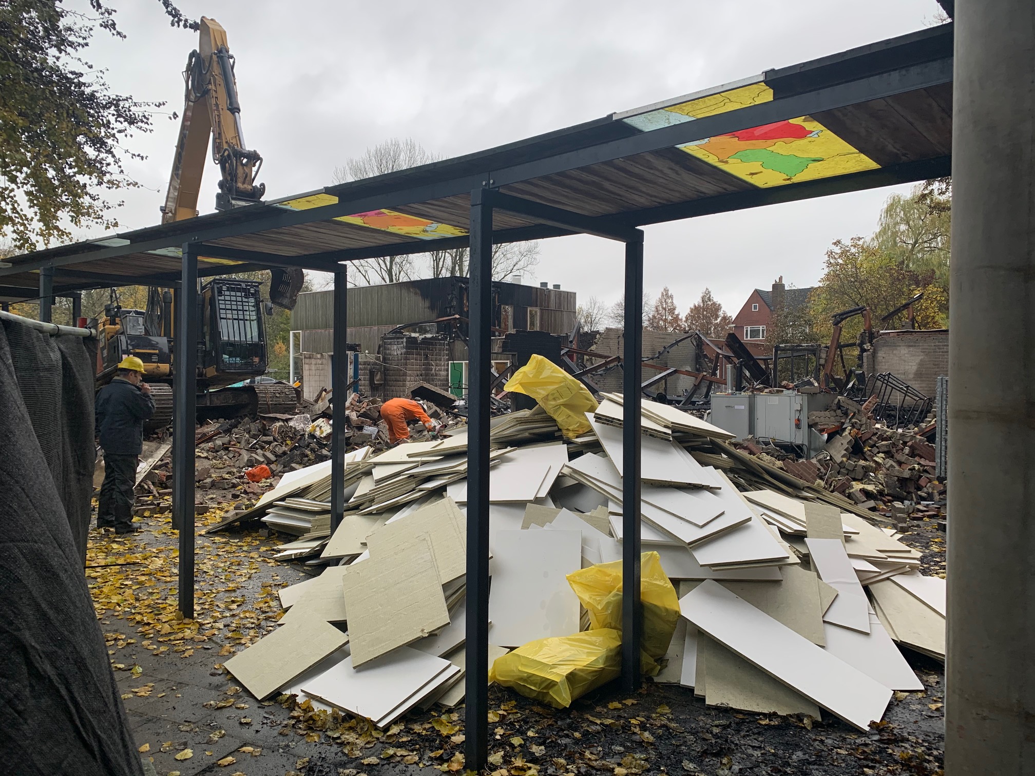 Met man en macht werd er maandag gewerkt op het terrein van basisschool Het Karrepad. Terwijl schoonmakers druk bezig waren in de leslokalen sloopte een kraan de restanten van de afgebrande gymzaal.