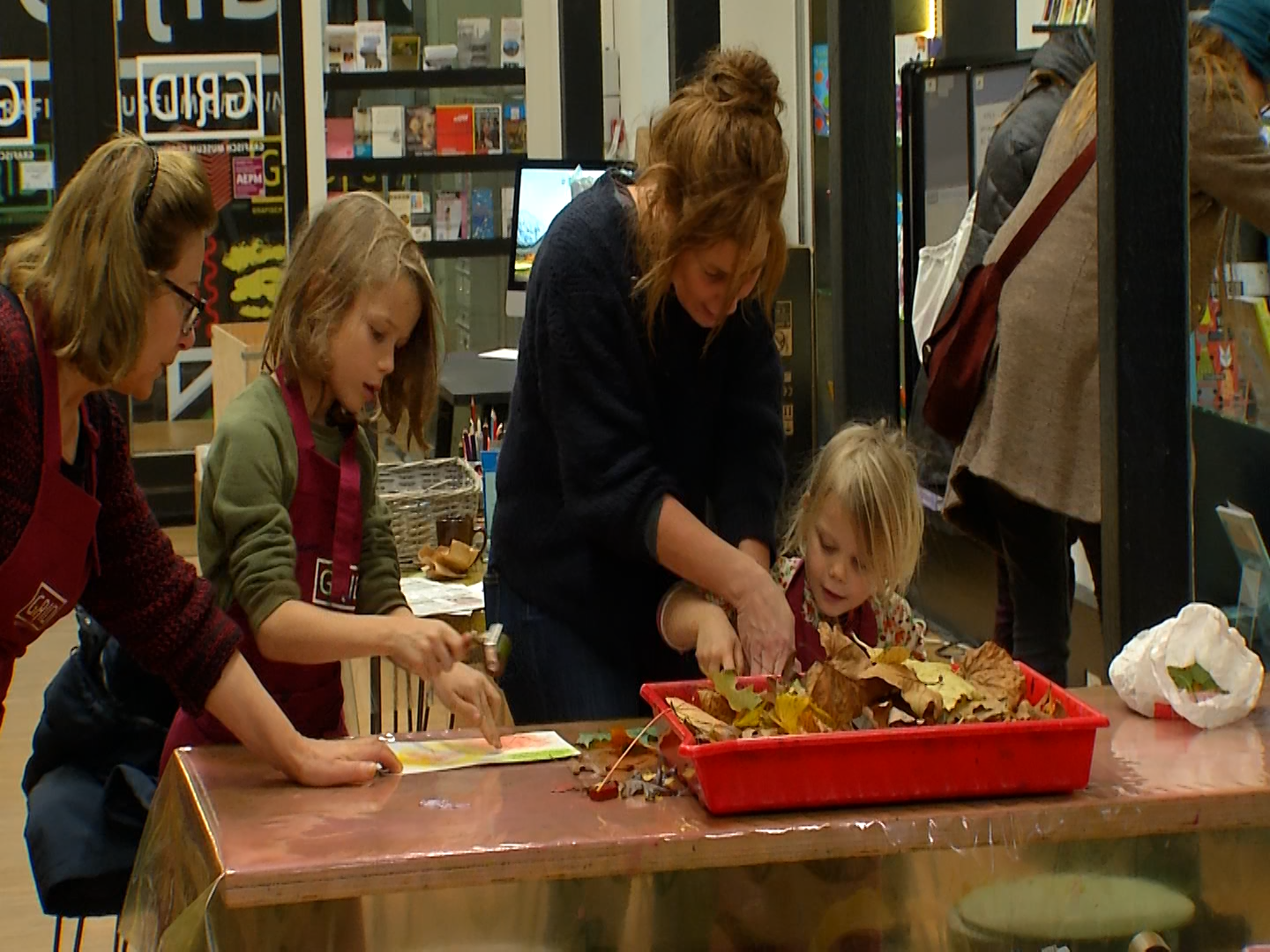 Je kon vandaag herfststukjes maken bij het Grafisch Museum. ‘We hebben het thema herfst. We werken met bladeren van de bomen en daarvan kunnen de kinderen leuke kunstwerken maken’, zegt Rinze van de Berche, de activiteitenbegeleider van het Grafisch Museum. ‘Ik ben het blaadje aan het overschilderen’, zegt Eerin.