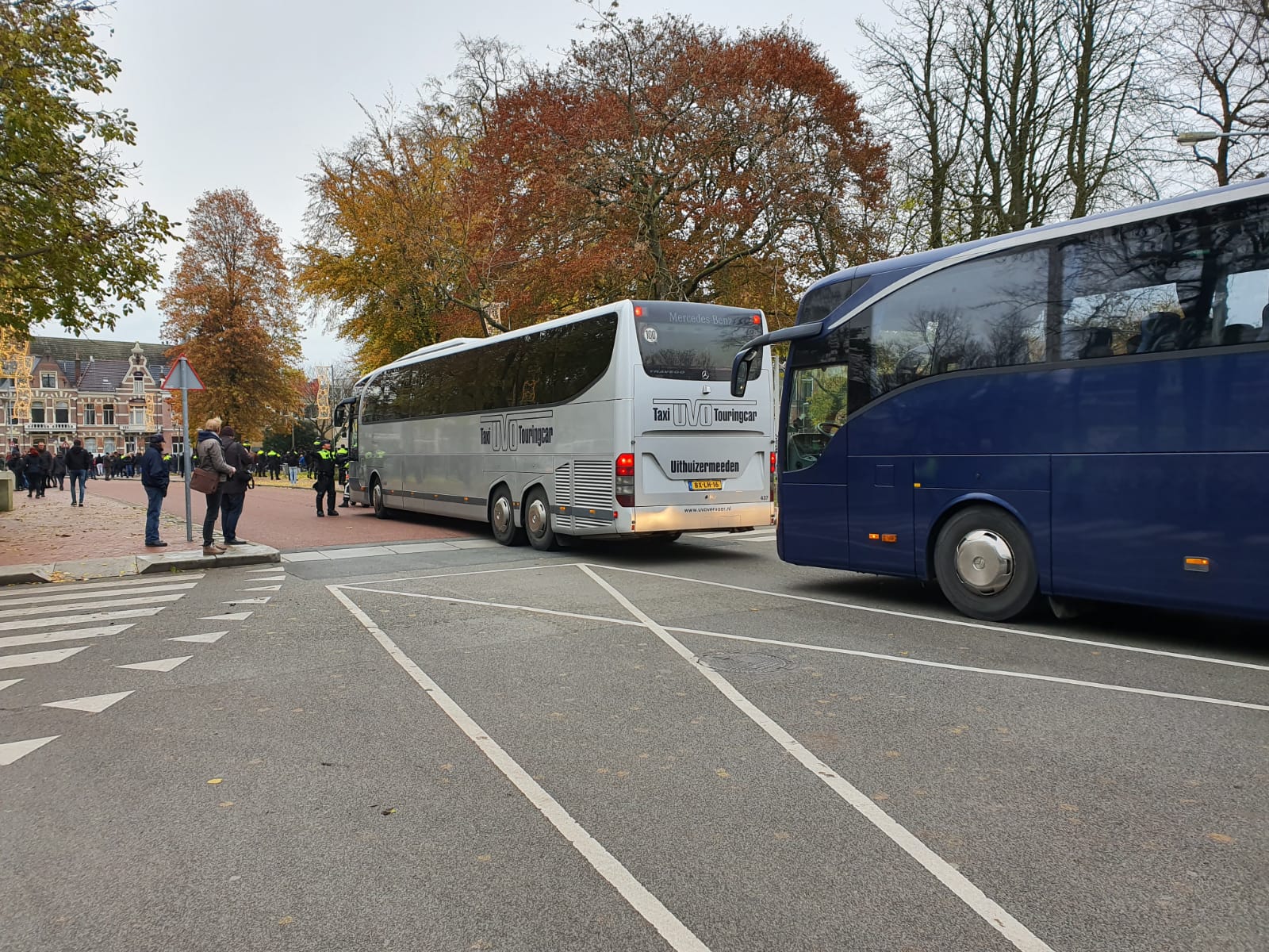 Nabij het Emmaplein zijn zojuist een aantal bussen gearriveerd. Aan boord aanhangers van Kick Out Zwarte Piet (KOZP). De bussen zijn vertrokken vanaf een geheime plek. In het demonstratievak op het Emmaplein gaan zij straks tijdens de rijtoer hun protestgeluid laten horen. Voorstanders van Zwarte Piet hebben zich verzameld aan de andere kant van het plein. Martin Nuver van de incidentenwebsite 112groningen.nl schat dat er op dit moment zo’n tweehonderd mensen aanwezig zijn op het plein.