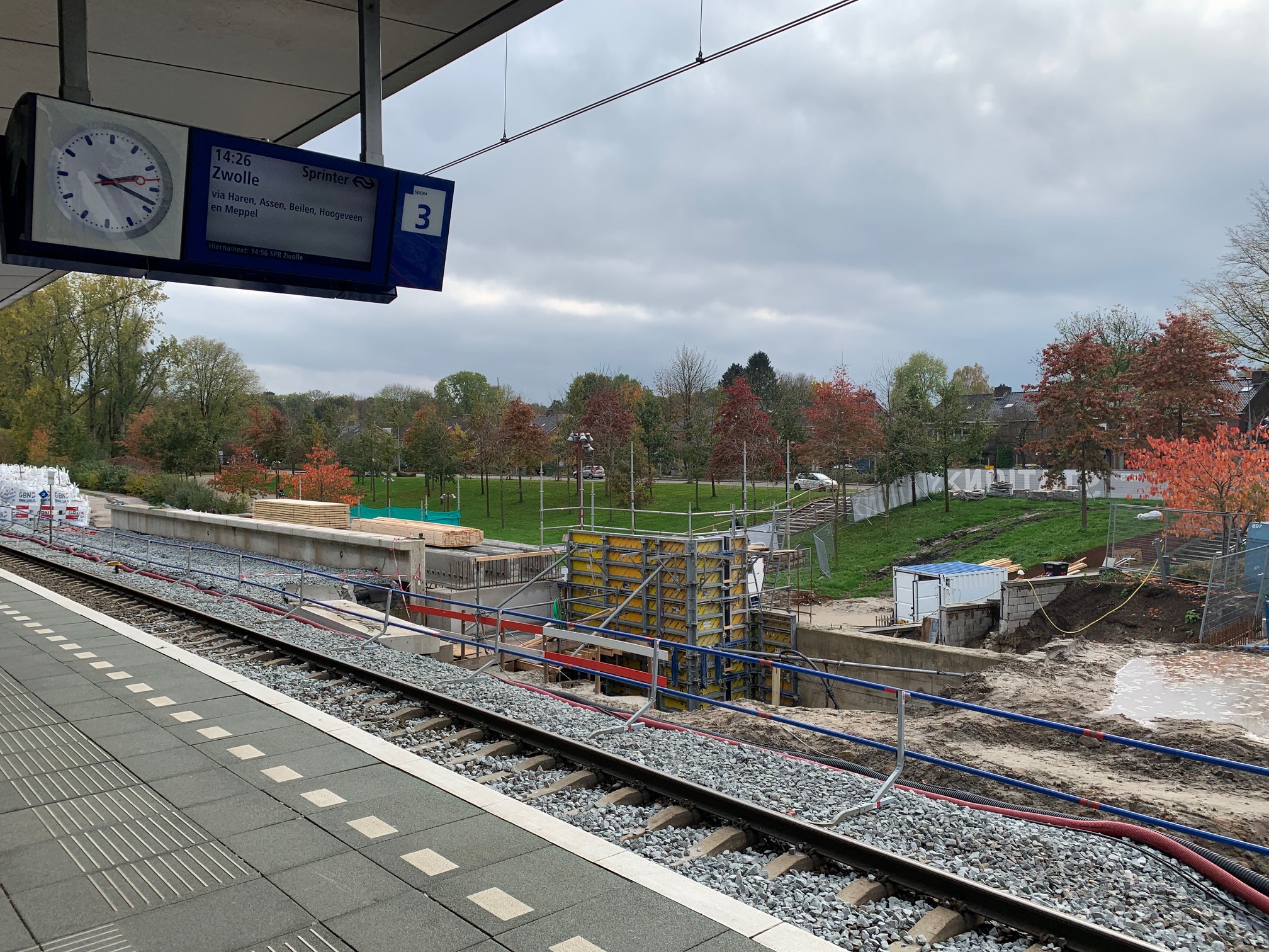 Maandagochtend werden de liggers voor het nieuwe perron geplaatst. “Ondanks de werkzaamheden blijft het station geopend voor de reizigers”, vertelt Han Berends van spoorbeheerder ProRail. “Hier aan de zuidzijde komt een perron met een lengte van tweehonderd meter. Het zal dezelfde uitstraling krijgen als de andere drie perrons die hier een aantal jaren geleden zijn aangelegd.”