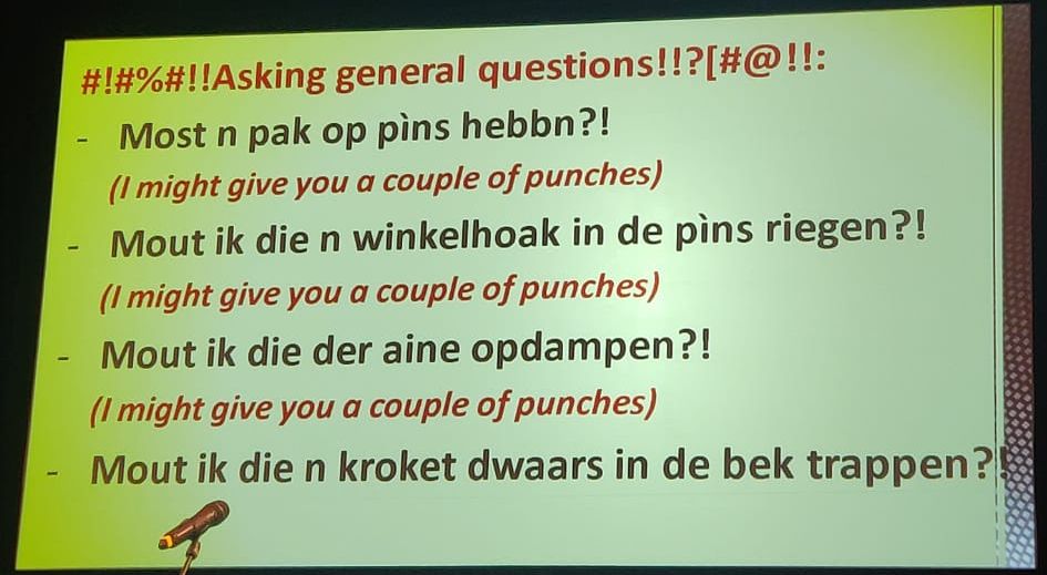 Olaf Vos – onder meer bekend van RTV Noord en de Groninger band Van De Straat- leerde de studenten een mondje Grunnegs. En dan met name de belangrijkste woorden en zinnen om Groningen overdag en ’s nachts mee door te komen. Onderwerpen als ‘hoe vraag ik de weg?’ en boodschappen doen, maar ook het uitgaansleven en nachtelijke verschijnselen passeerden de revue.