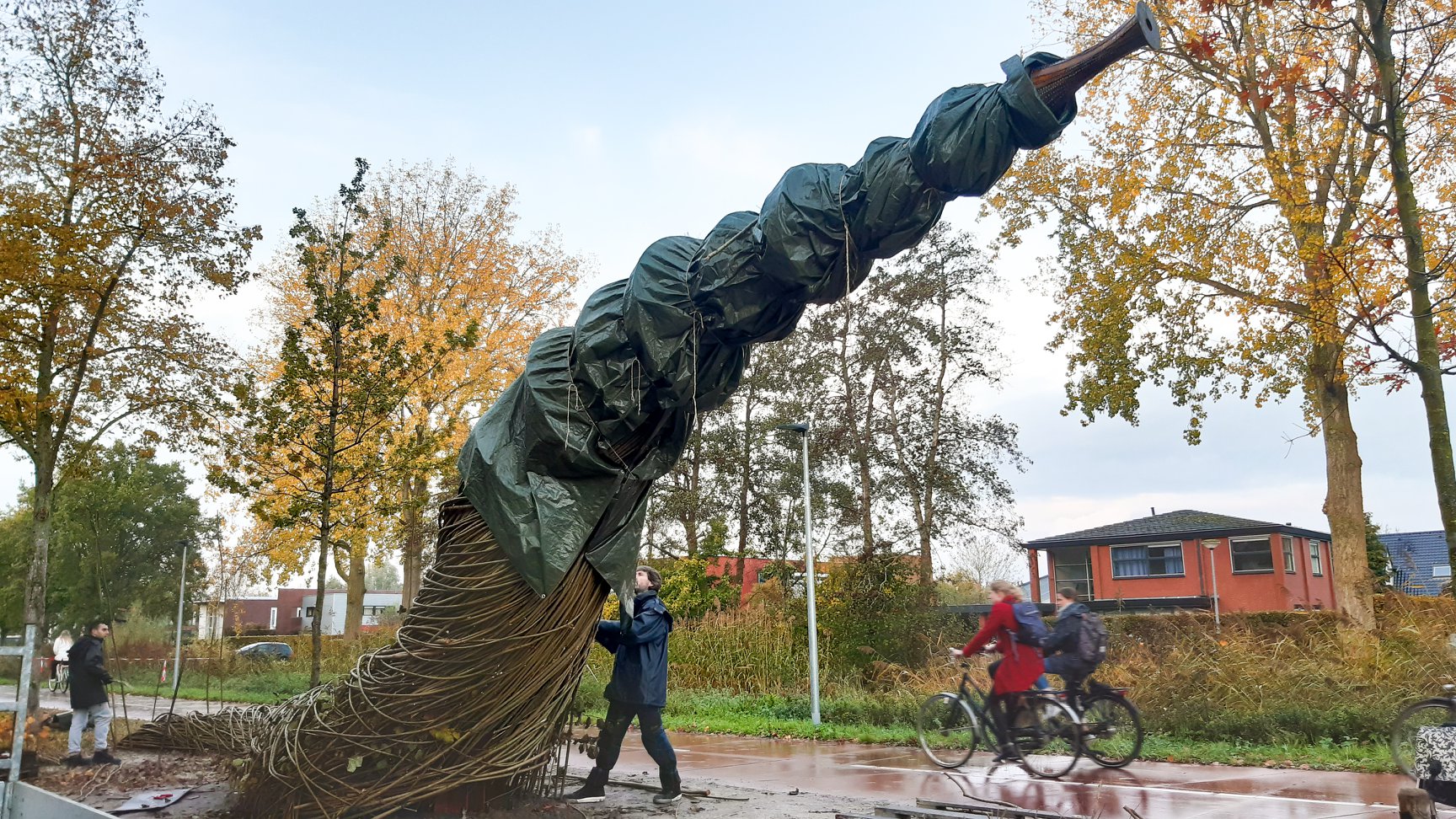 ‘Kunstenaar Will Beckers is druk bezig met zijn kunstwerken aan de fietssnelweg langs de Helperzoom. ‘Mysteries van Helperzoom’ leeft en groeit want naast staal bestaat het uit een lange vlecht van takken en levende hazelaars.