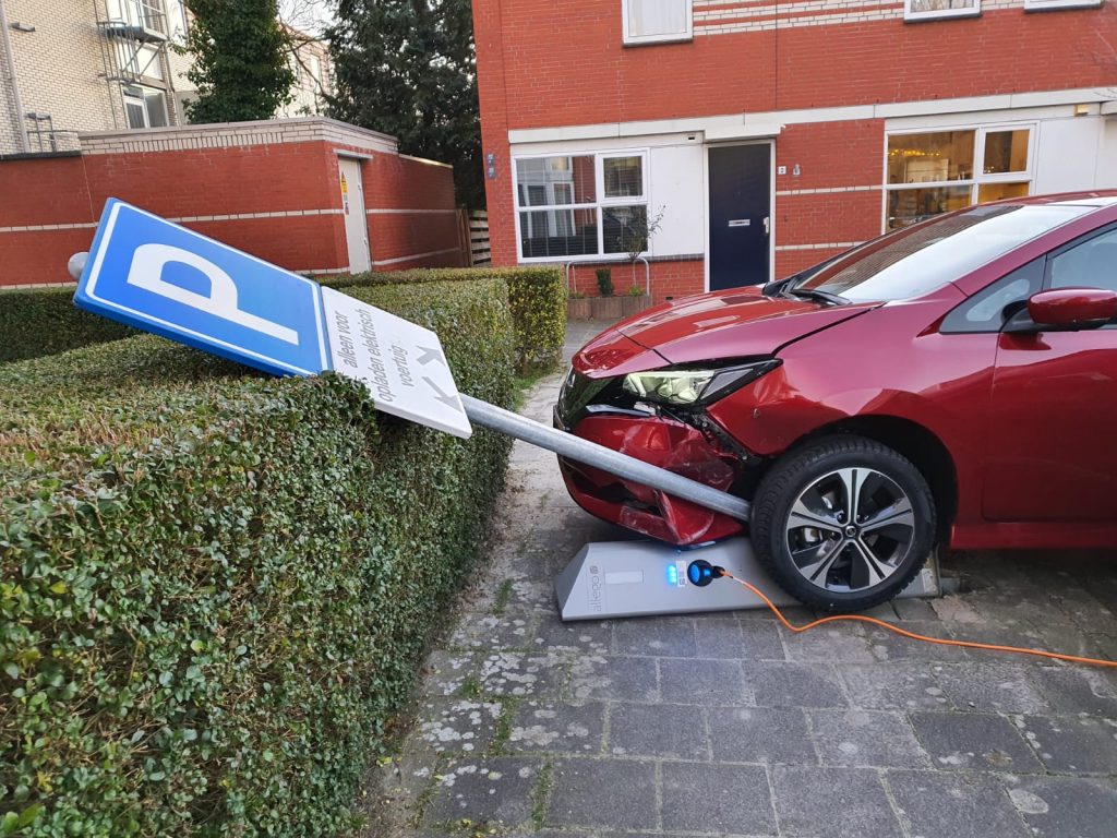 Het ongeluk gebeurde aan het einde van de middag. Behalve de laadpaal werd ook een bord omver gereden. “Het gaat om een gloednieuwe auto”, vertelt Wind. “De auto is sinds vanochtend op de weg. Hoe het ongeluk precies heeft kunnen gebeuren is onbekend.” Niemand raakte gewond.