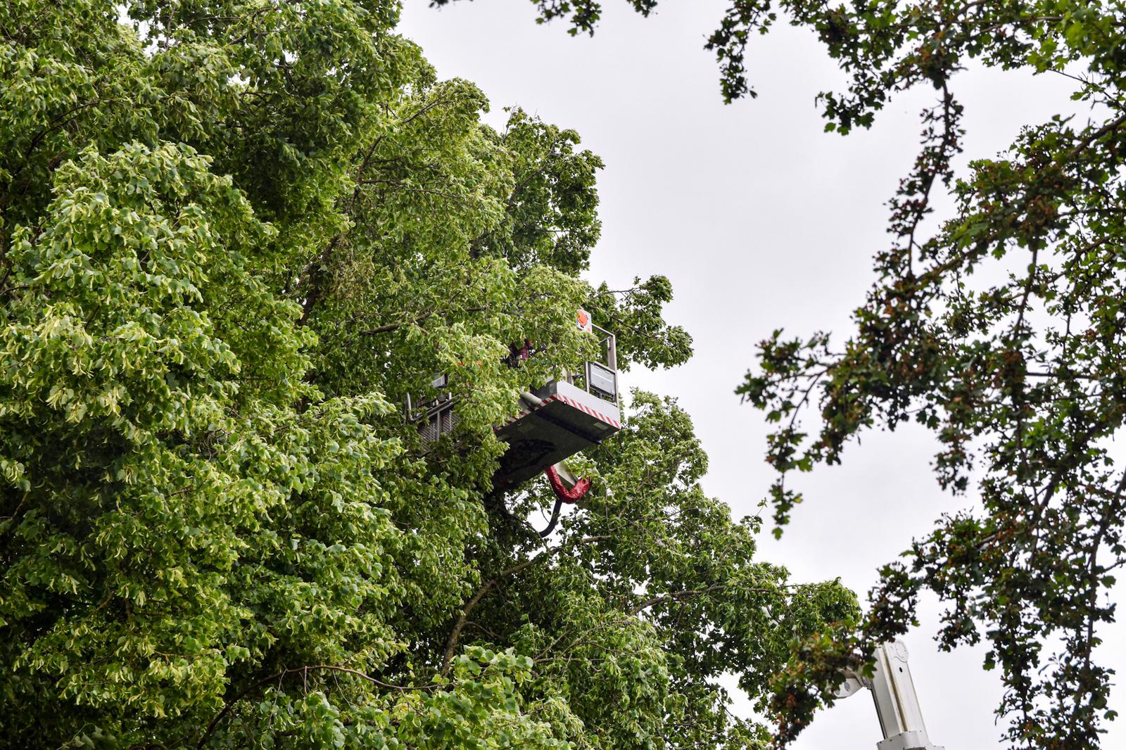 Een brandweerman is in de korf van de hoogwerker omhoog gegaan om de loshangende tak te verwijderen. Foto: Rick ten Cate - tencatefotografie.nl