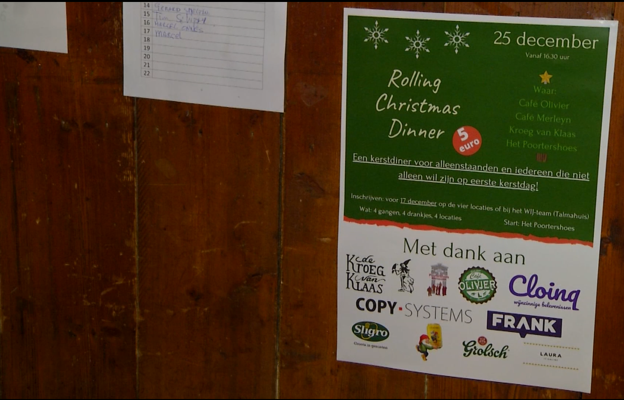 Het diner wordt georganiseerd voor alleenstaanden of mensen die zich tijdens de kerstdagen eenzaam voelen. Voor een bedrag van vijf euro kunnen mensen zich inschrijven voor het Rolling Christmas Dinner. De avond begint in Het Poortershoes, daar staat een welkomstdrankje klaar. Daarna kunnen de mensen aanschuiven in de Kroeg van Klaas voor het voorgerecht. Het hoofdgerecht wordt geserveerd in café Olivier en in café Merleyn wordt de avond afgesloten met het toetje.
