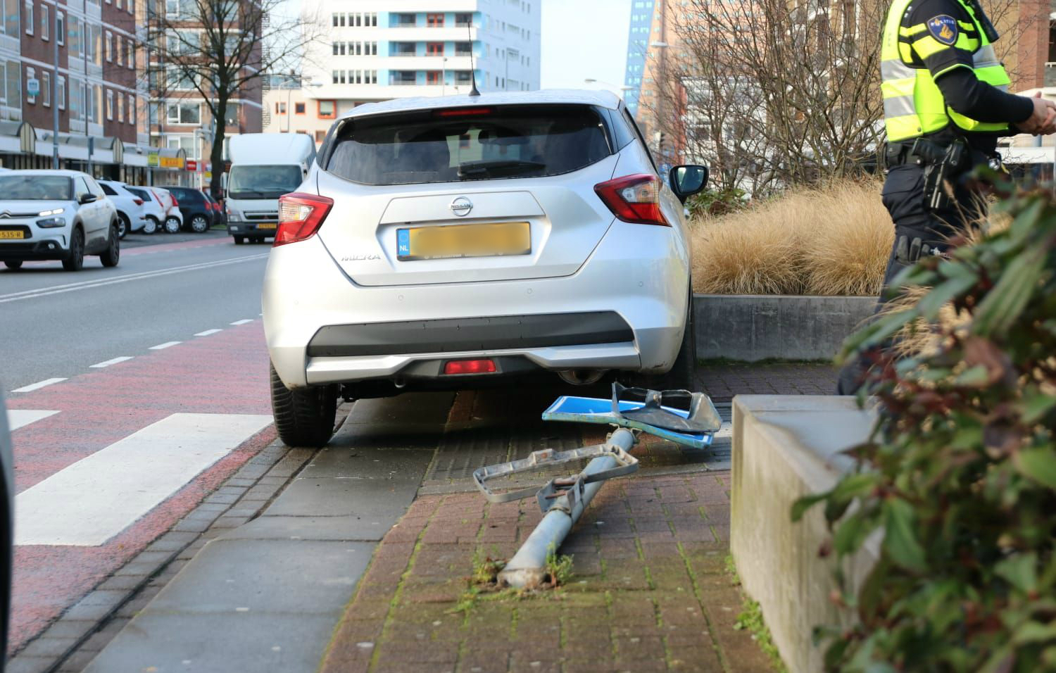 Op het Overwinningsplein in de Stad is dinsdagmiddag een vrouw lichtgewond geraakt nadat ze met haar auto een verkeersbord tegen een paal met een verkeersbord aanreed.