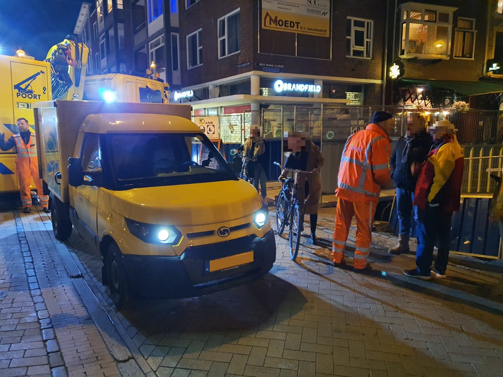 Een elektrische bezorgauto is maandagavond betrokken geraakt bij een merkwaardig ongeval in de binnenstad. De wagen kwam boven een gat veroorzaakt door wegwerkzaamheden te hangen. Dat meldt Patrick Wind van de incidentenwebsite 112groningen.nl.