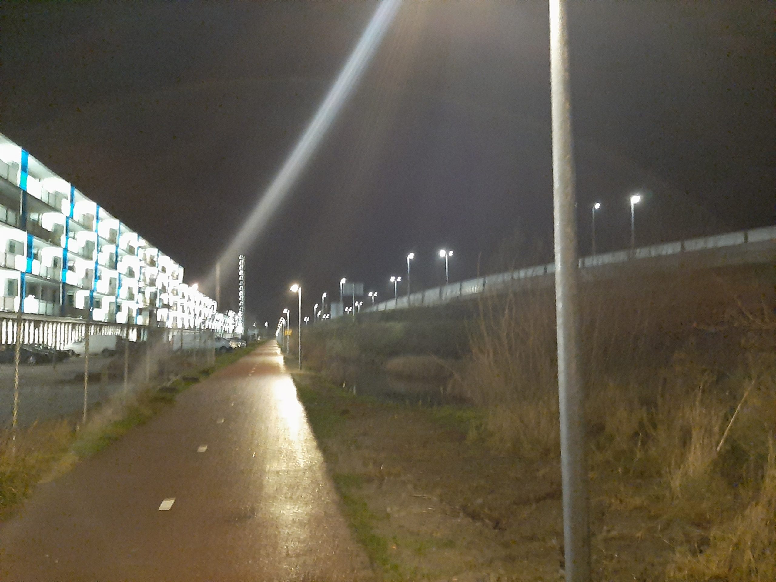 twee dingen: de appartementen staan er niet 'al jaren'. En: het is een zee van licht: het licht van de appartementen en van de ringweg. Compleet onnodig om daar ook nog straatverlichting bij het fietspad bij te doen.