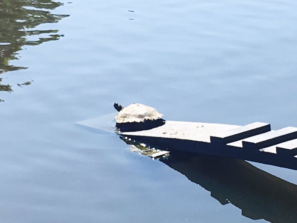 ‘Ik ben zó benieuwd hoe dit af zal lopen dat ik een onderzoekje start. Eind maart 2019 kruipen de eerste overlevende schildpadden weer omhoog om op te warmen op de loopplankjes. Vanaf die tijd leg ik ze vast op de foto om de individuen te kunnen onderscheiden. De schildpadjes hebben allemaal een individueel herkenbare koptekening. Tot mijn verrassing lijken vele het baggeren te hebben overleefd. Sommige herken ik van eerdere jaren. Later ontdek ik de nieuwkomers die dit jaar weer door mensen zijn afgedankt’.