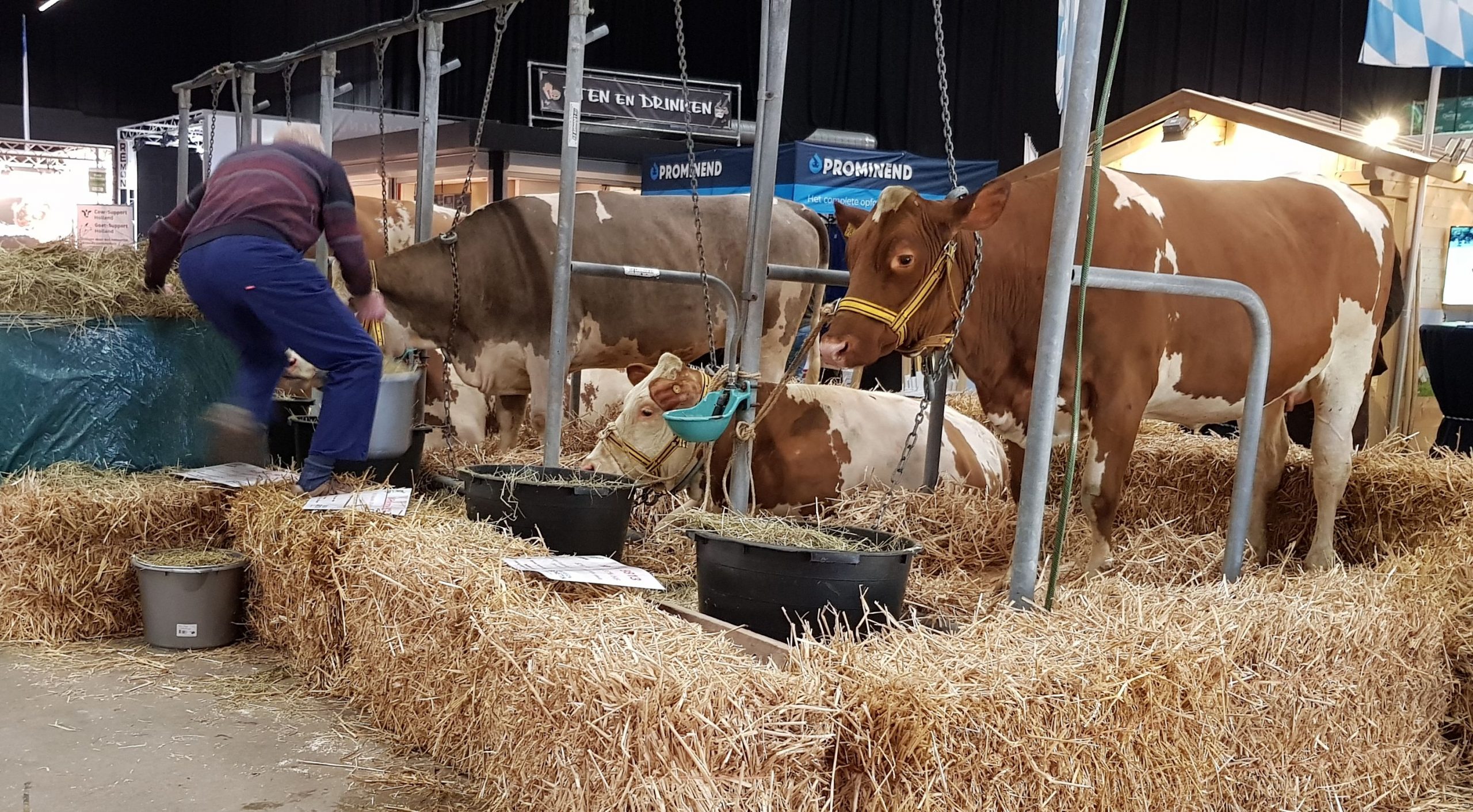 Op de landbouwvakbeurs in MartiniPlaza in Groningen staan de komende dagen niet alleen stands met promotiemateriaal, flyers en uitdeelpennen, maar ook ‘demonstratiemodellen’ voor vee. Ook zes Fleckvieh x Holstein kruisingskoeien zijn drie dagen lang te bewonderen door de bezoekende boeren.